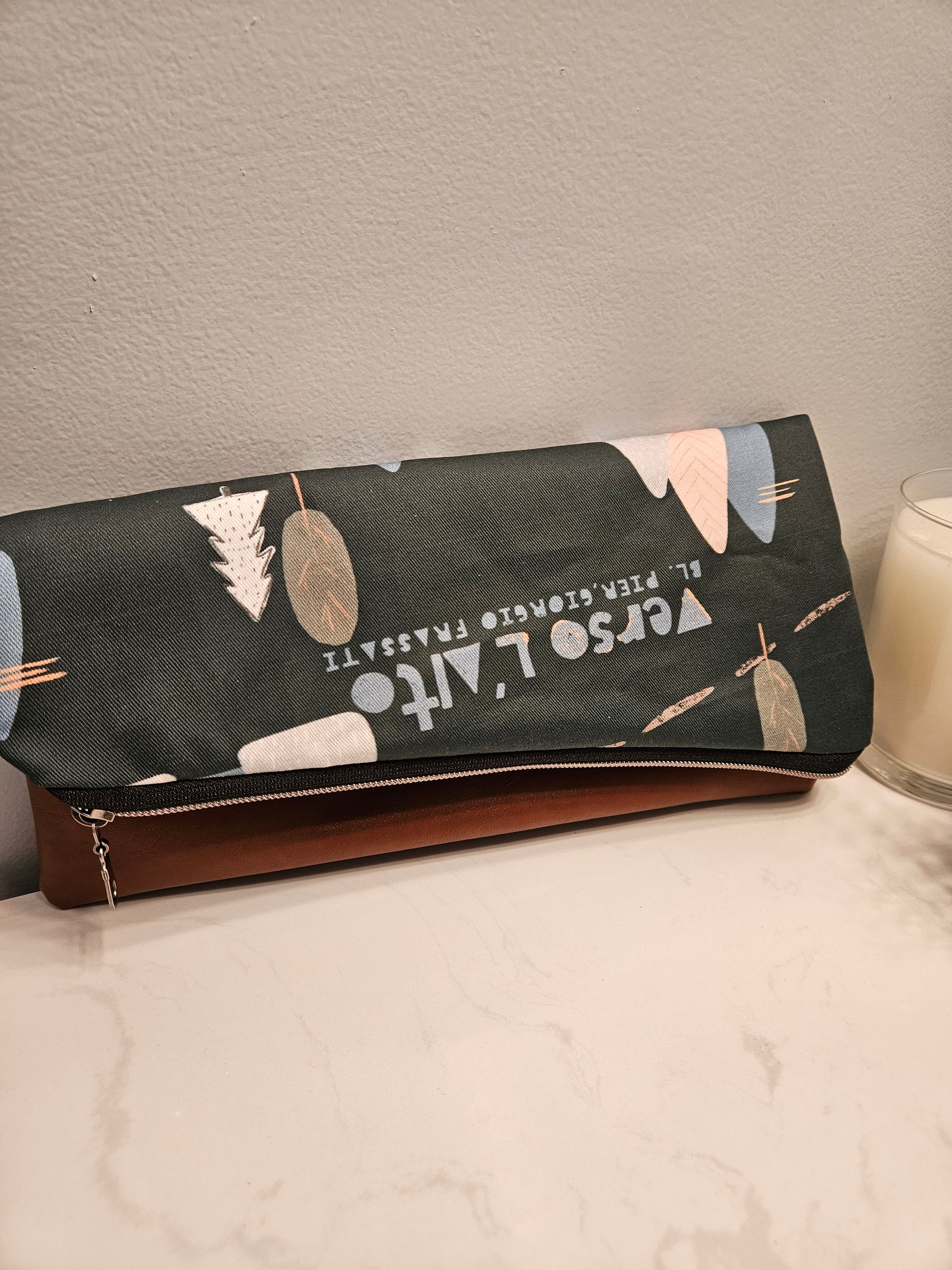 This foldover clutch features his famous quote "Verso I'alto" along with outdoor mountain graphics on the exterior fabric. Faux leather is at the base with a nylon zipper and metal zipper pull.