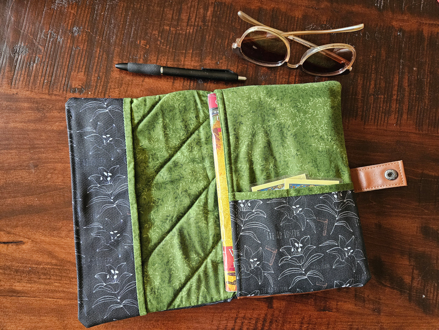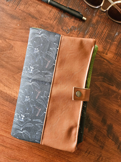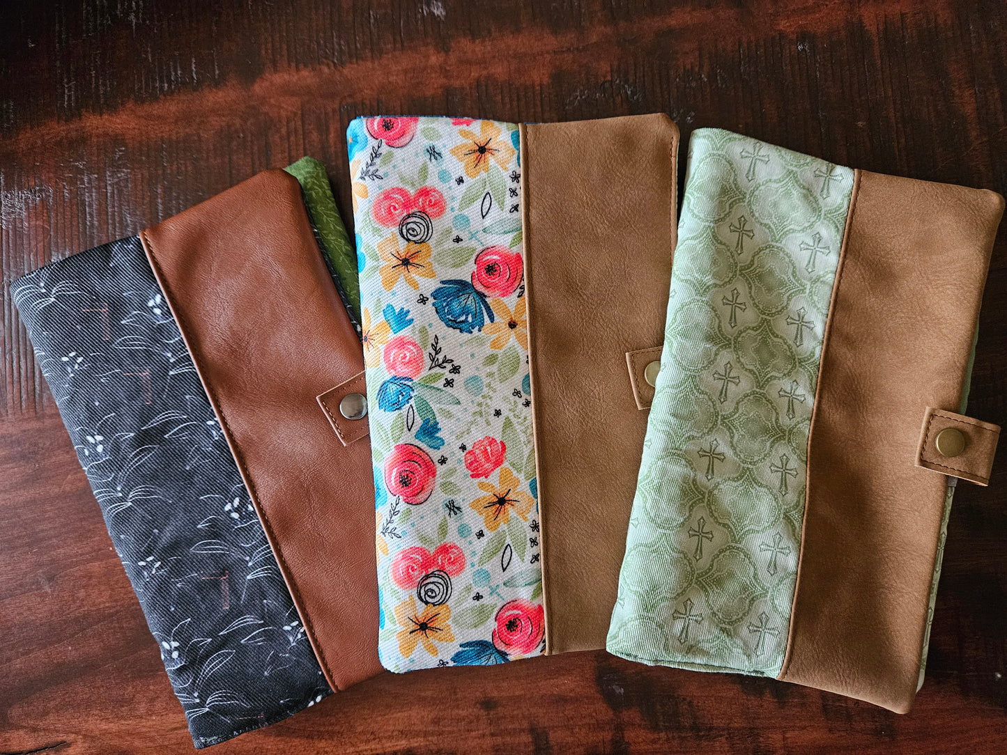 So here is my small collection of book covers with faux leather, a metal snap, and a slip pocket to hold prayer cards and such.