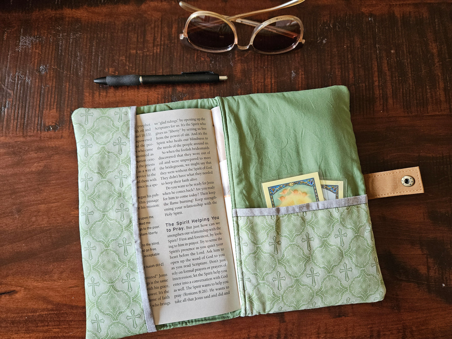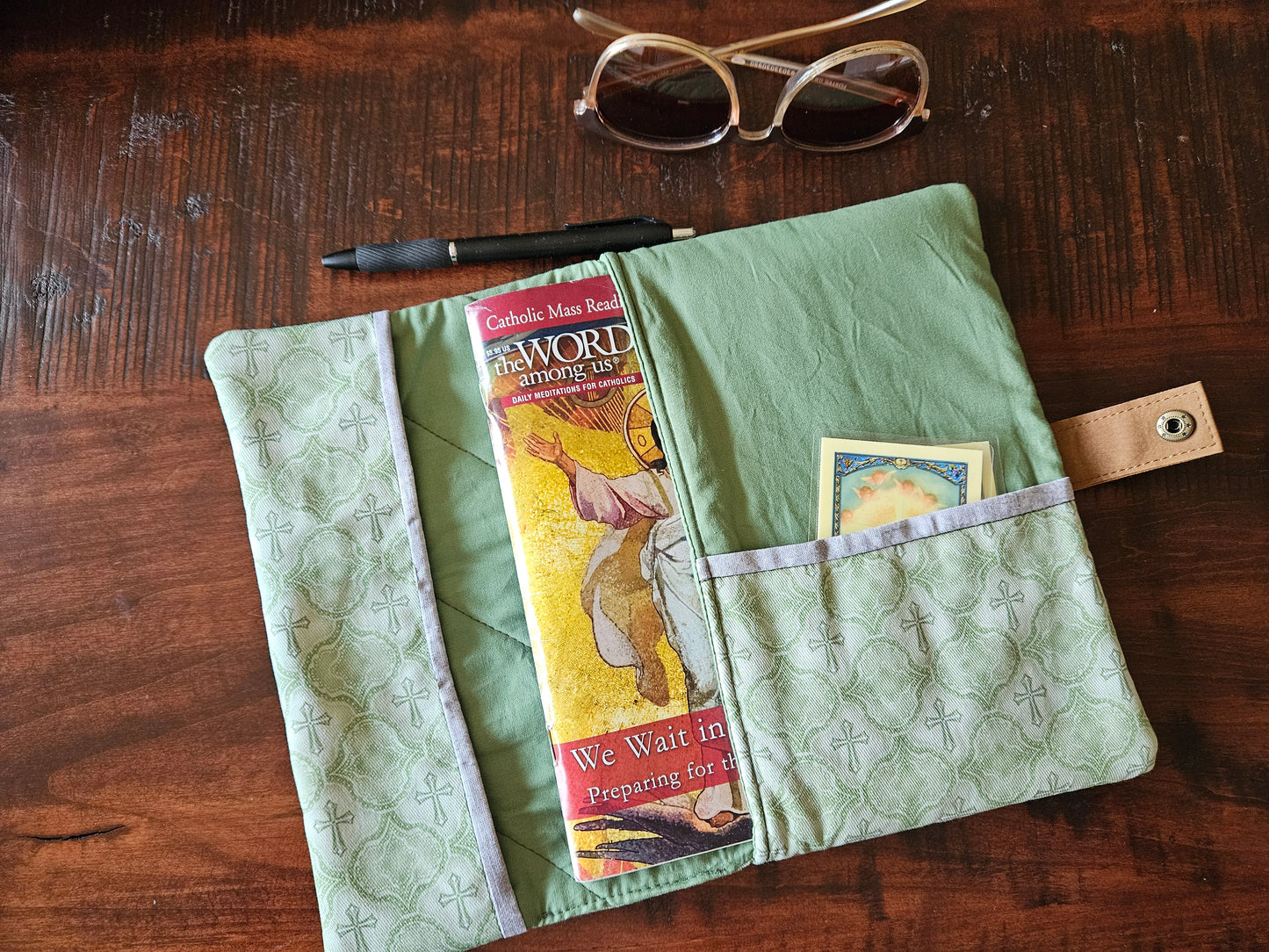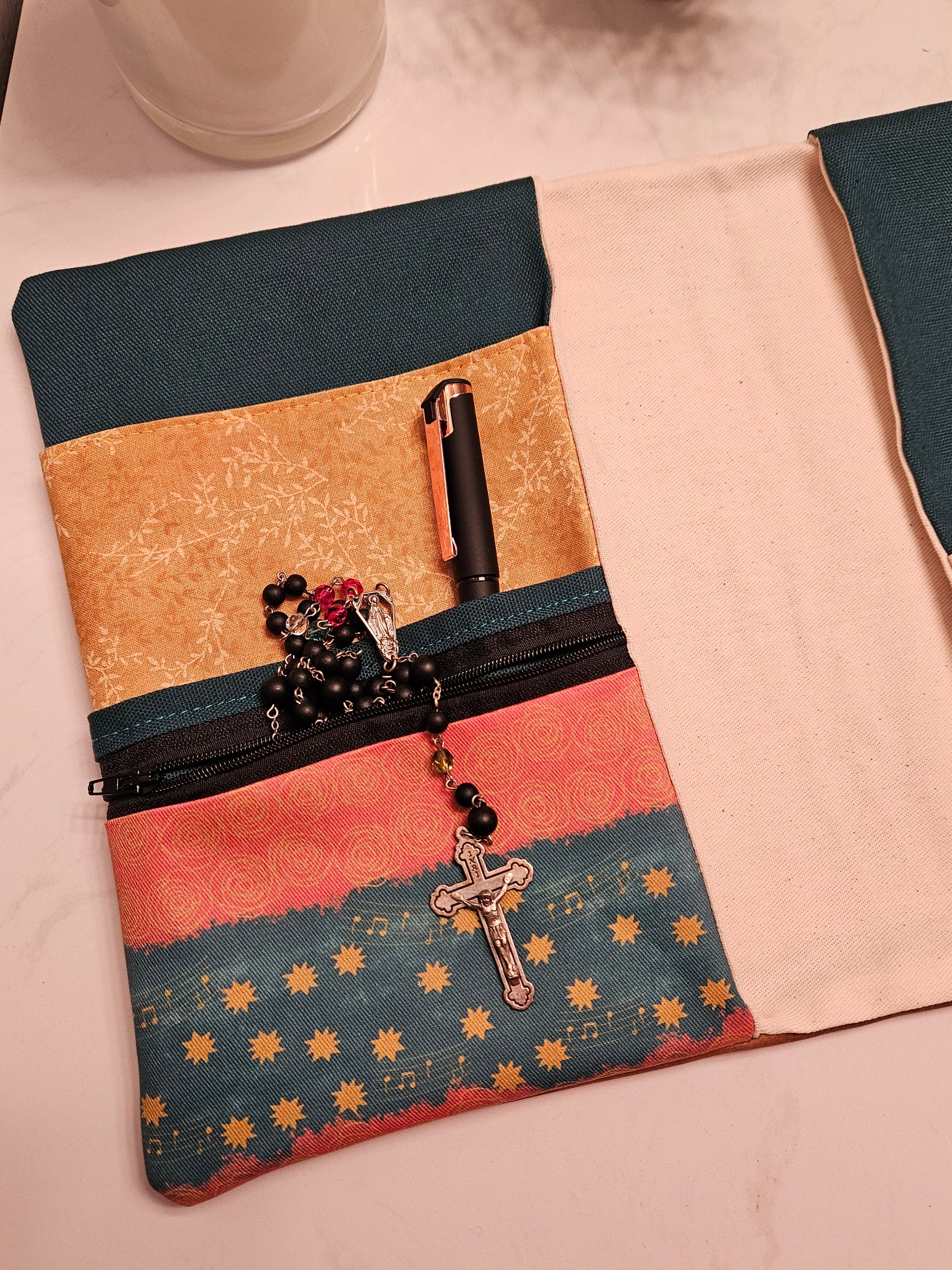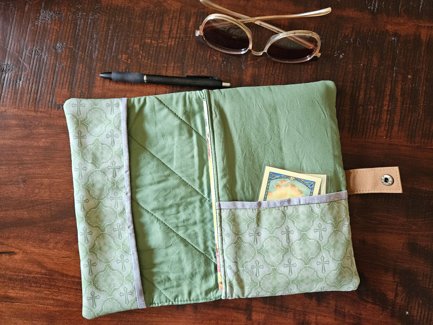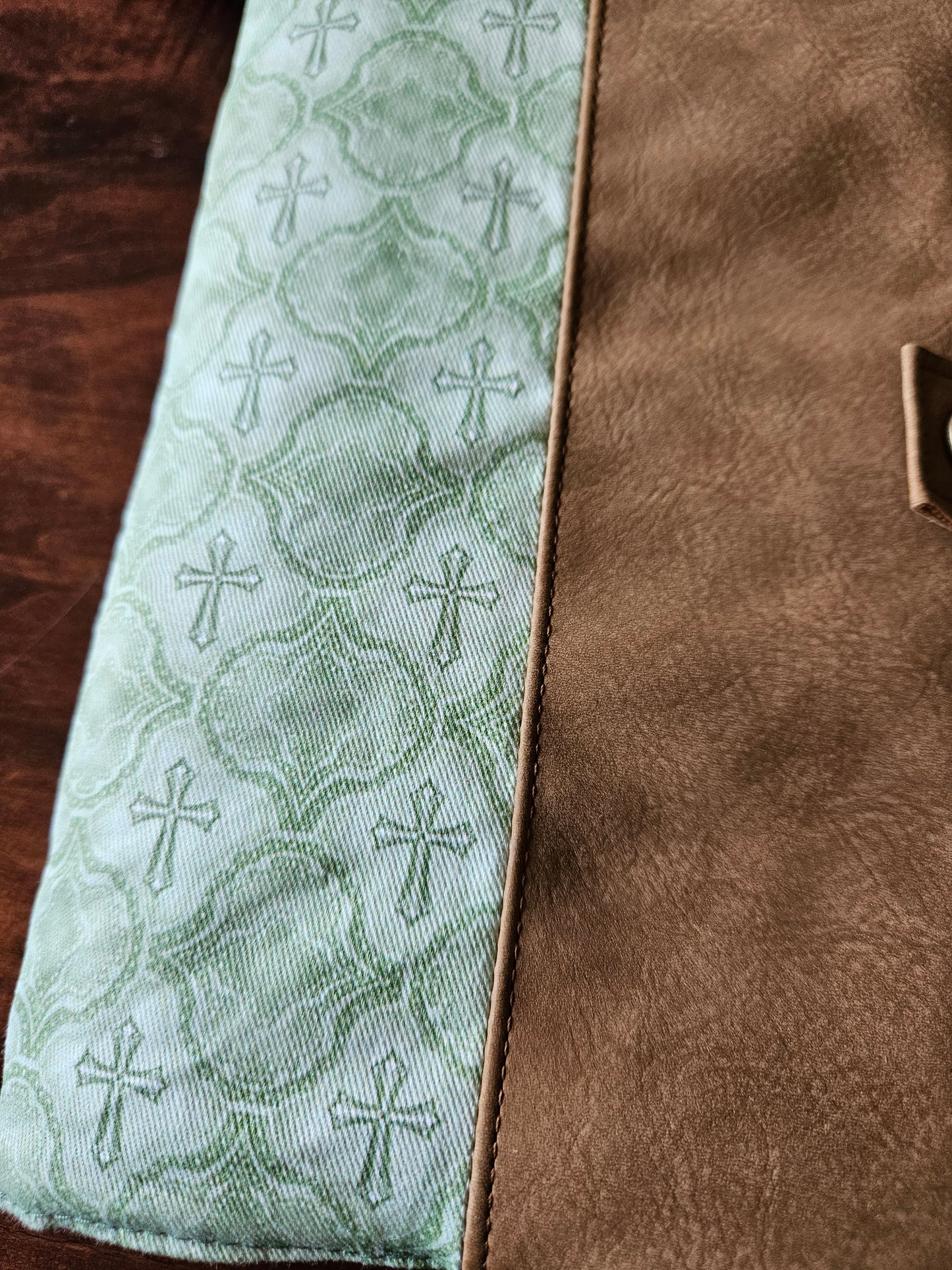 Made using faux leather with a metal snap. Interfacing quilted on the interior. Slip pocket and side piece in the Catholic fabric to hold the pages open in place of the typical elastic band.