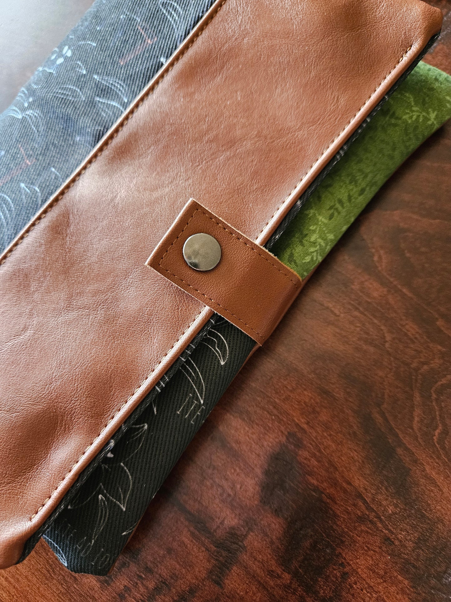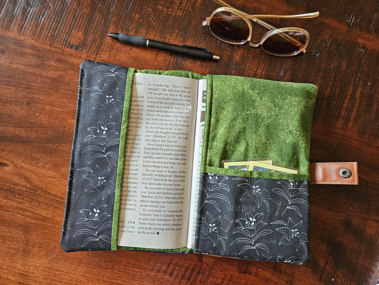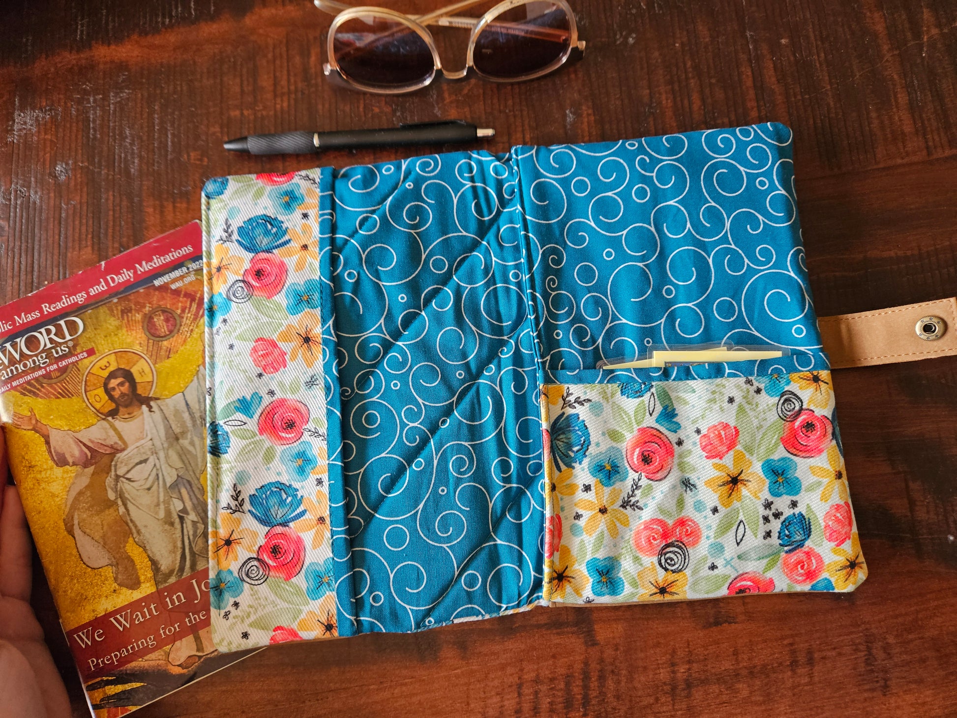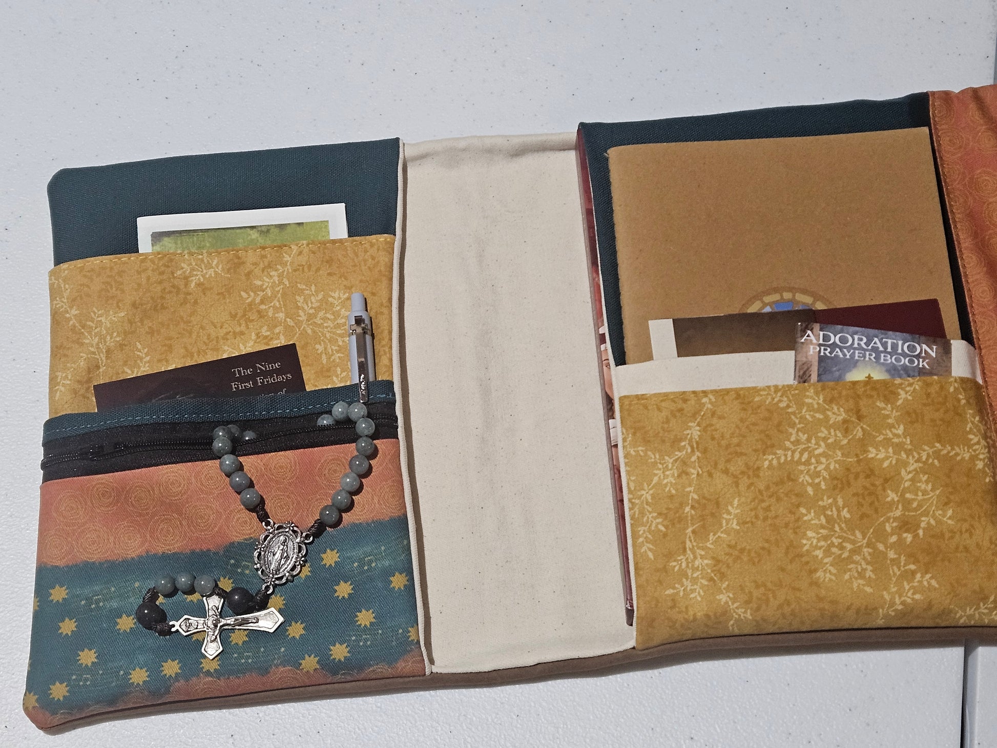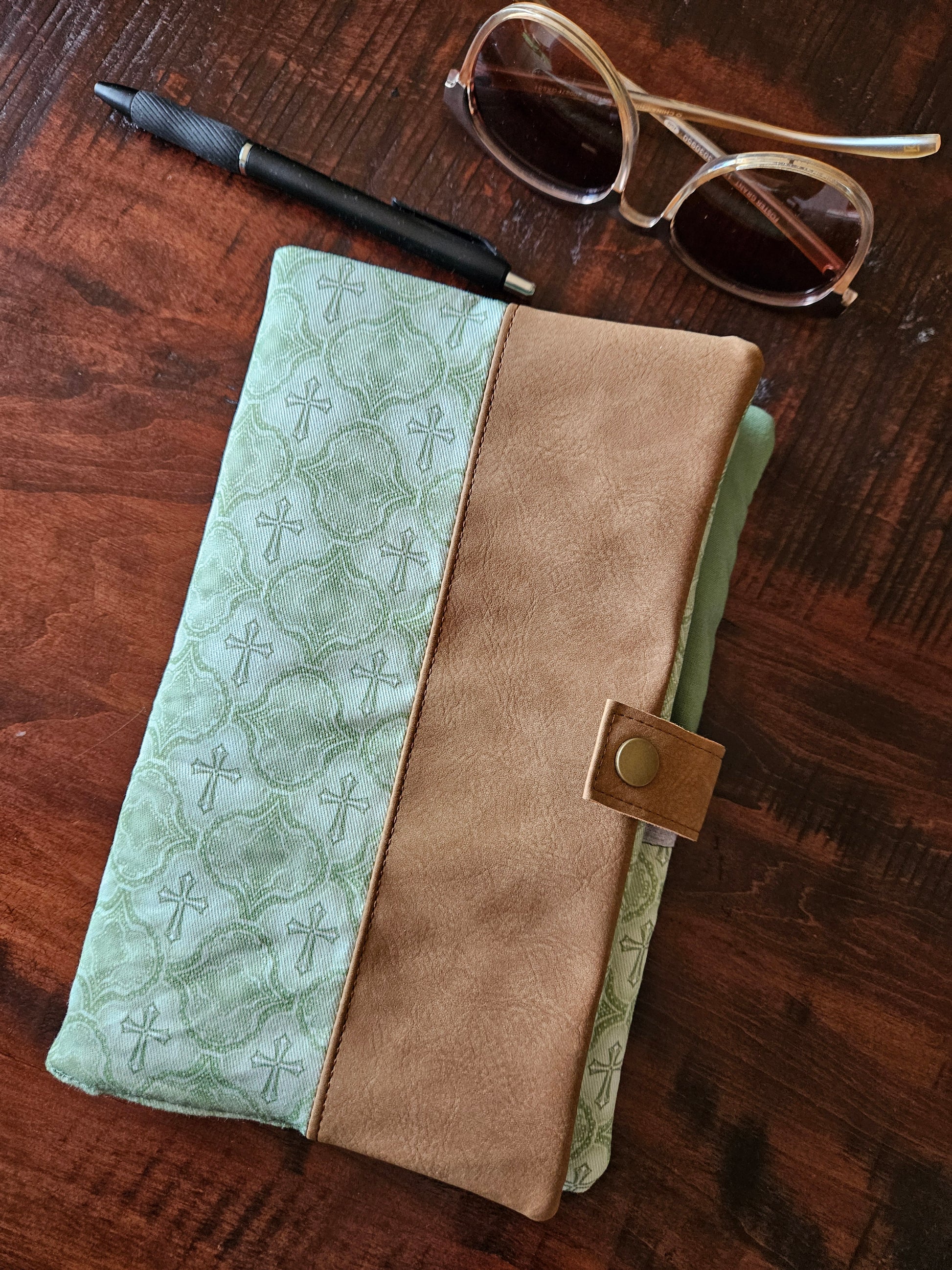 Made using faux leather with a metal snap. Interfacing quilted on the interior. Slip pocket and side piece in the Catholic fabric to hold the pages open in place of the typical elastic band.