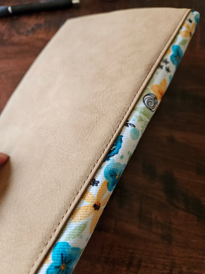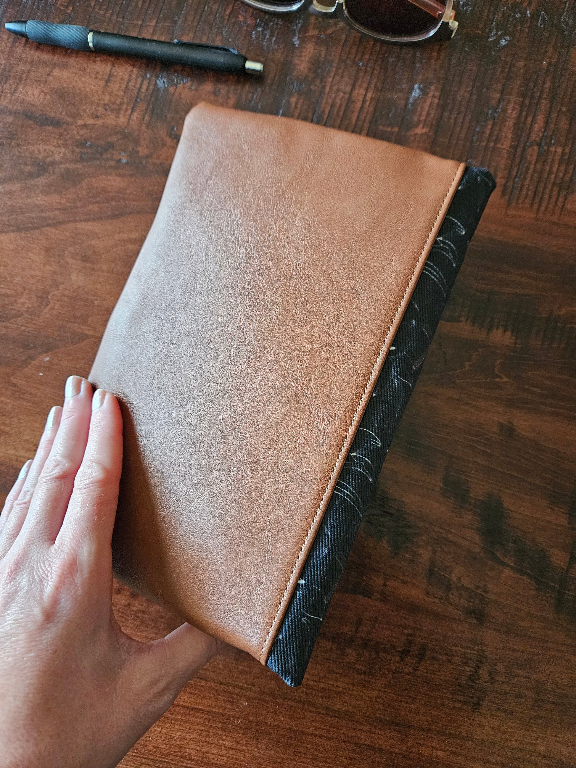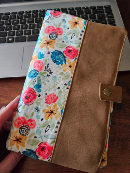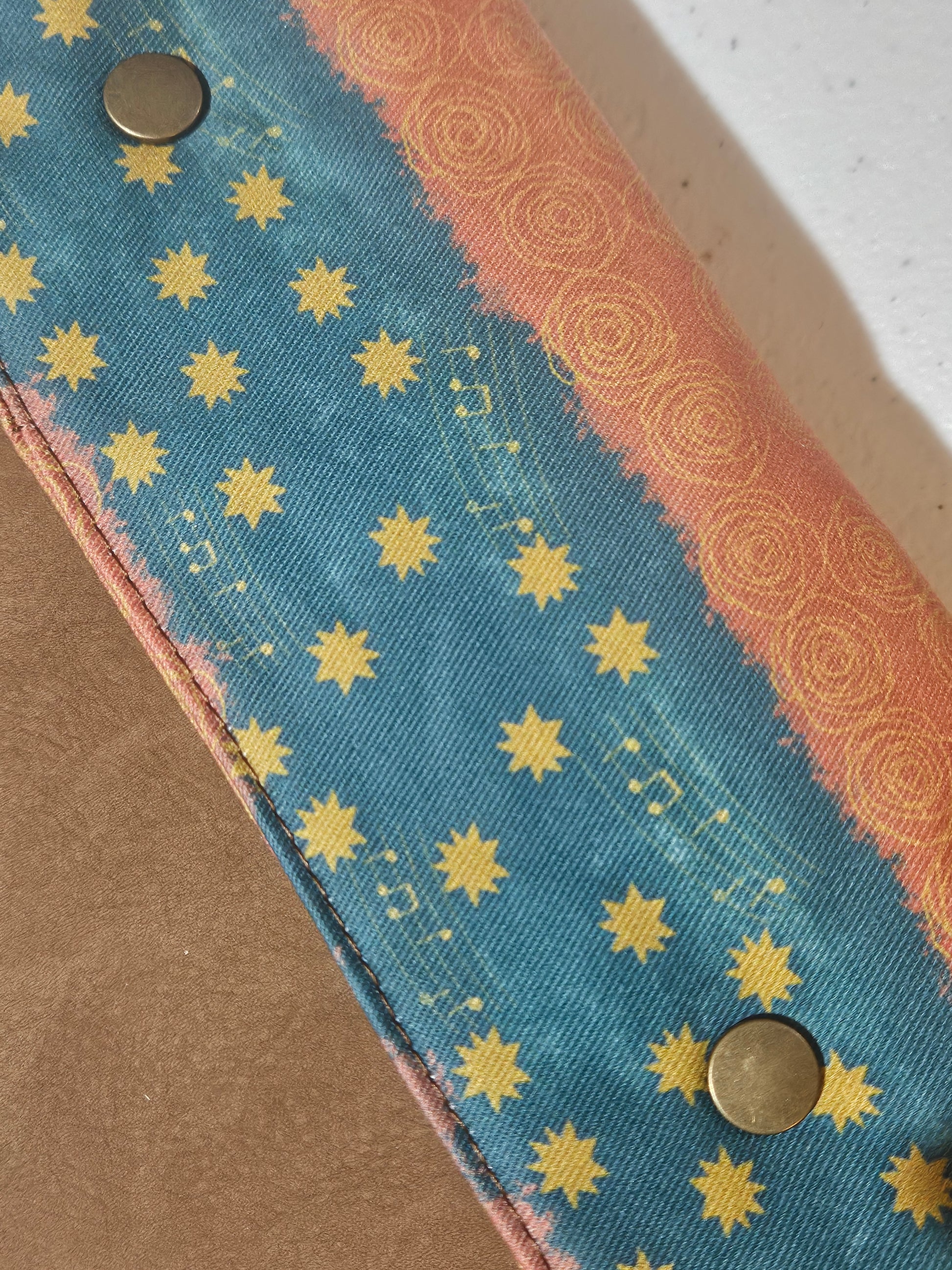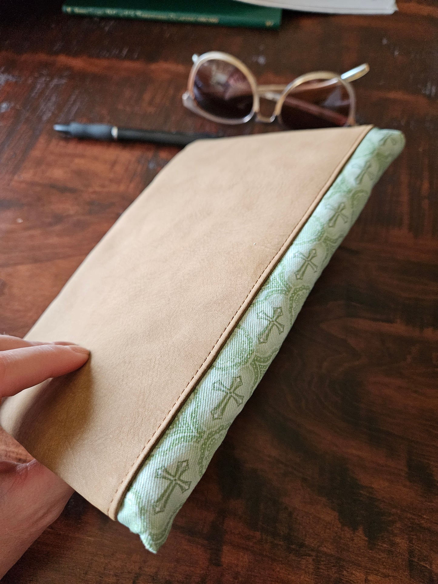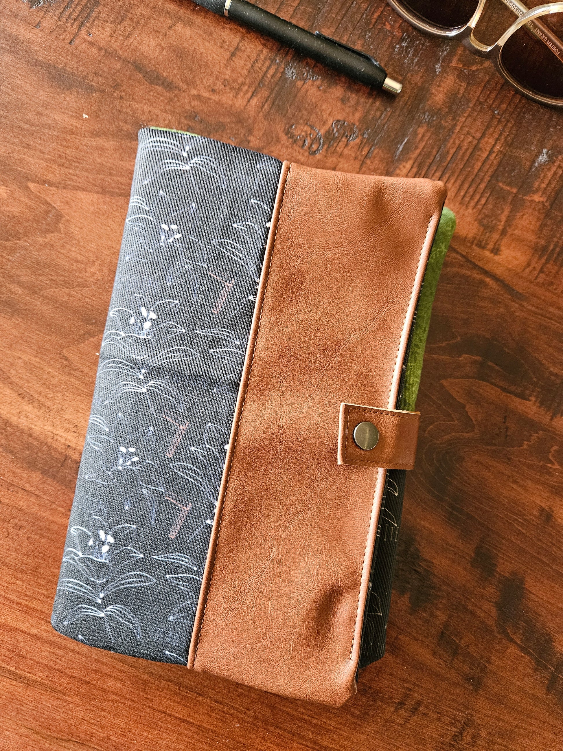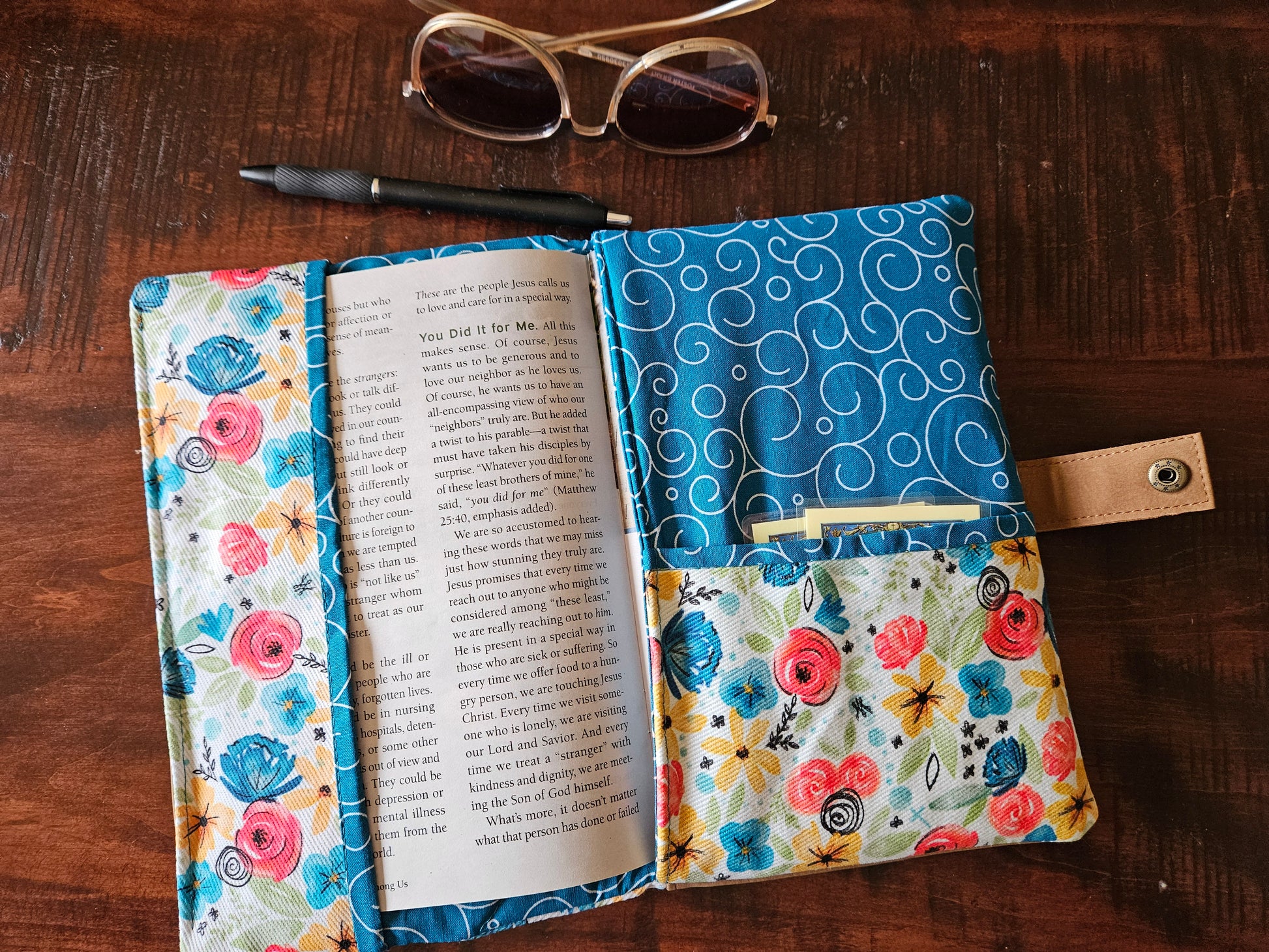 Made using faux leather with a metal snap. Interfacing quilted on the interior. Slip pocket and side piece in the Catholic fabric to hold the pages open in place of the typical elastic band.