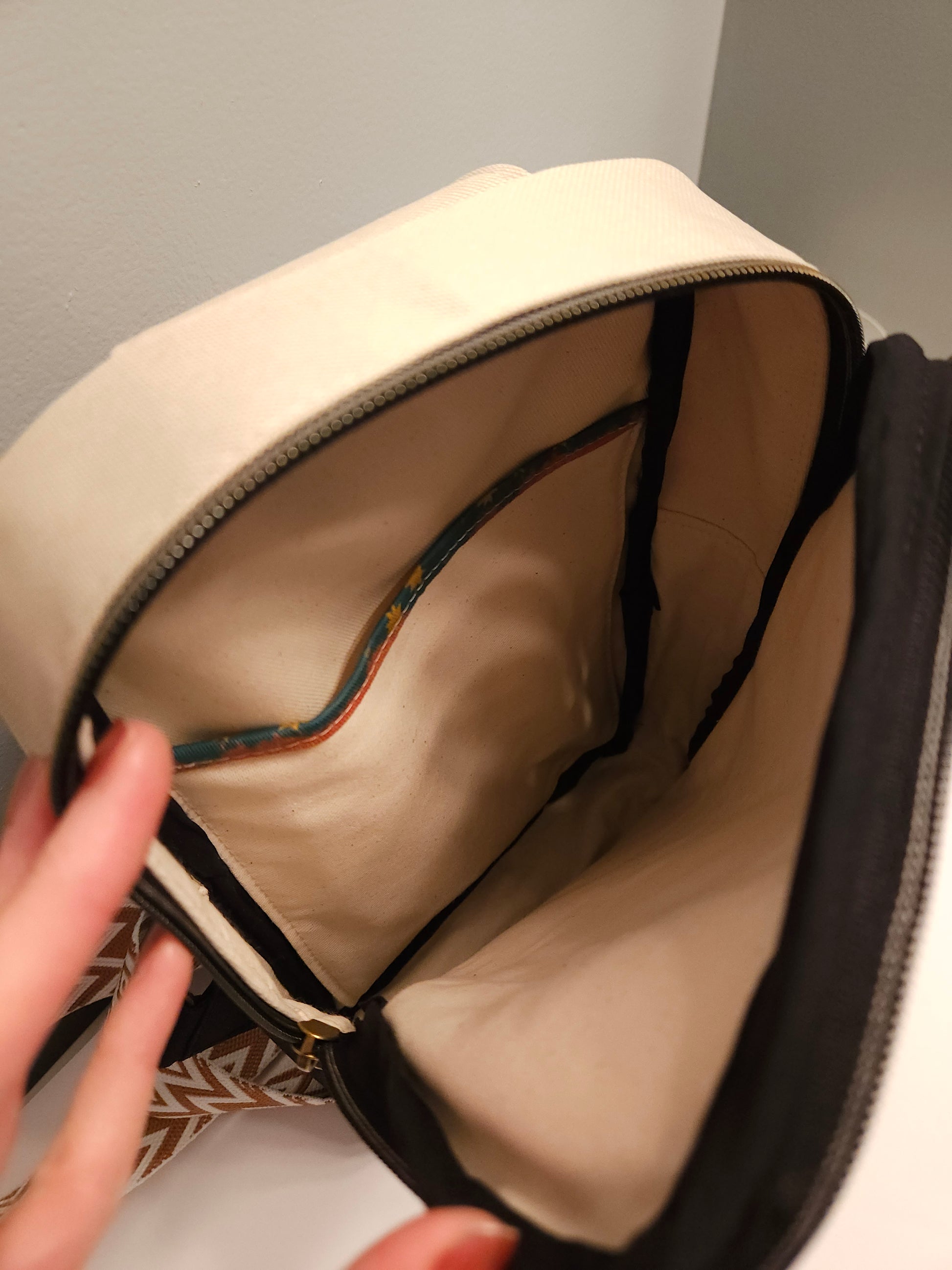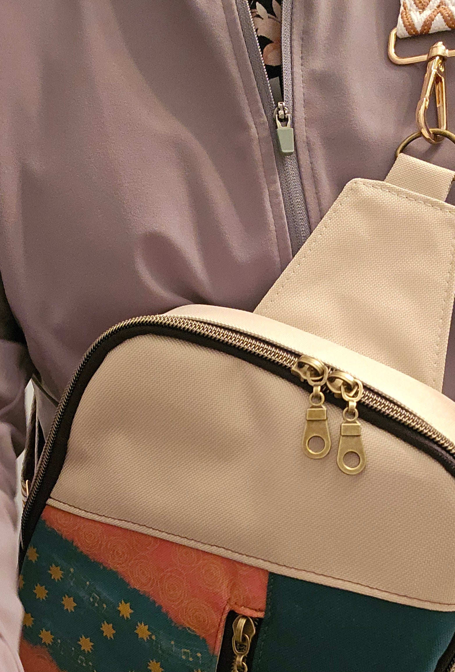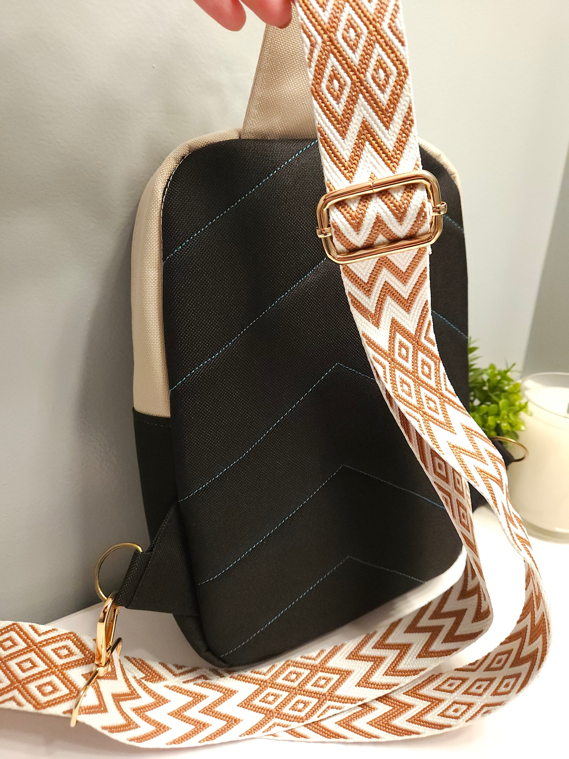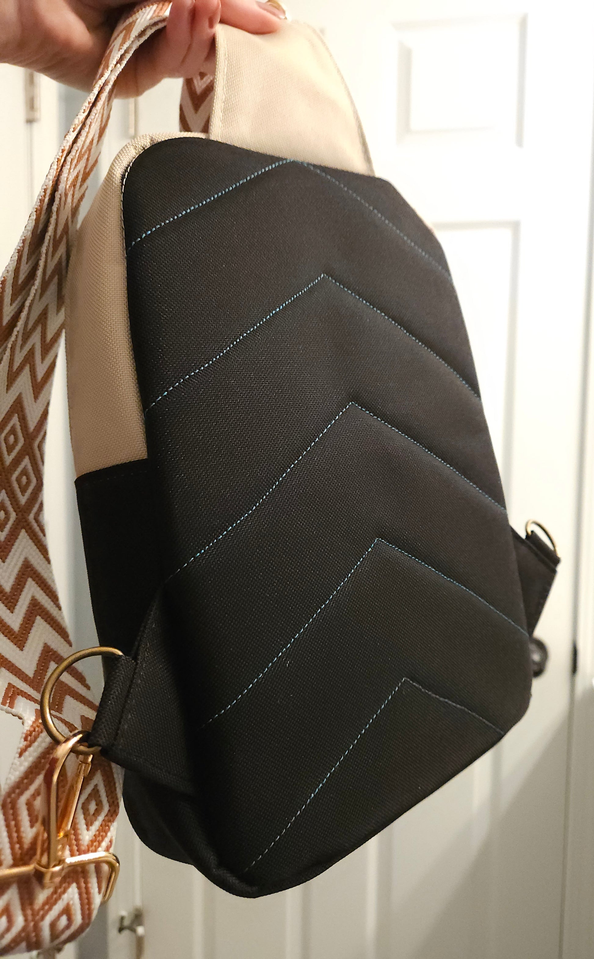 The strap is adjustable to wear it in front or in the back. The back is stitched in a chevron with a padded foam interfacing for structure and stability.