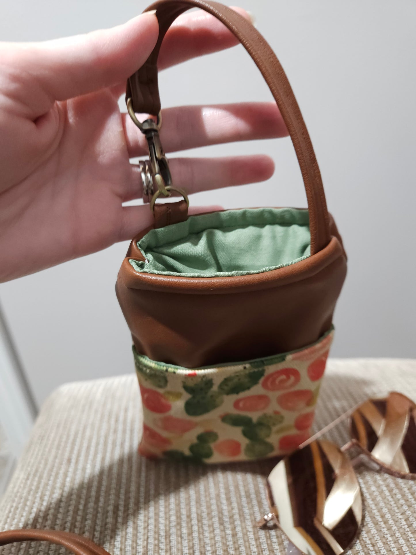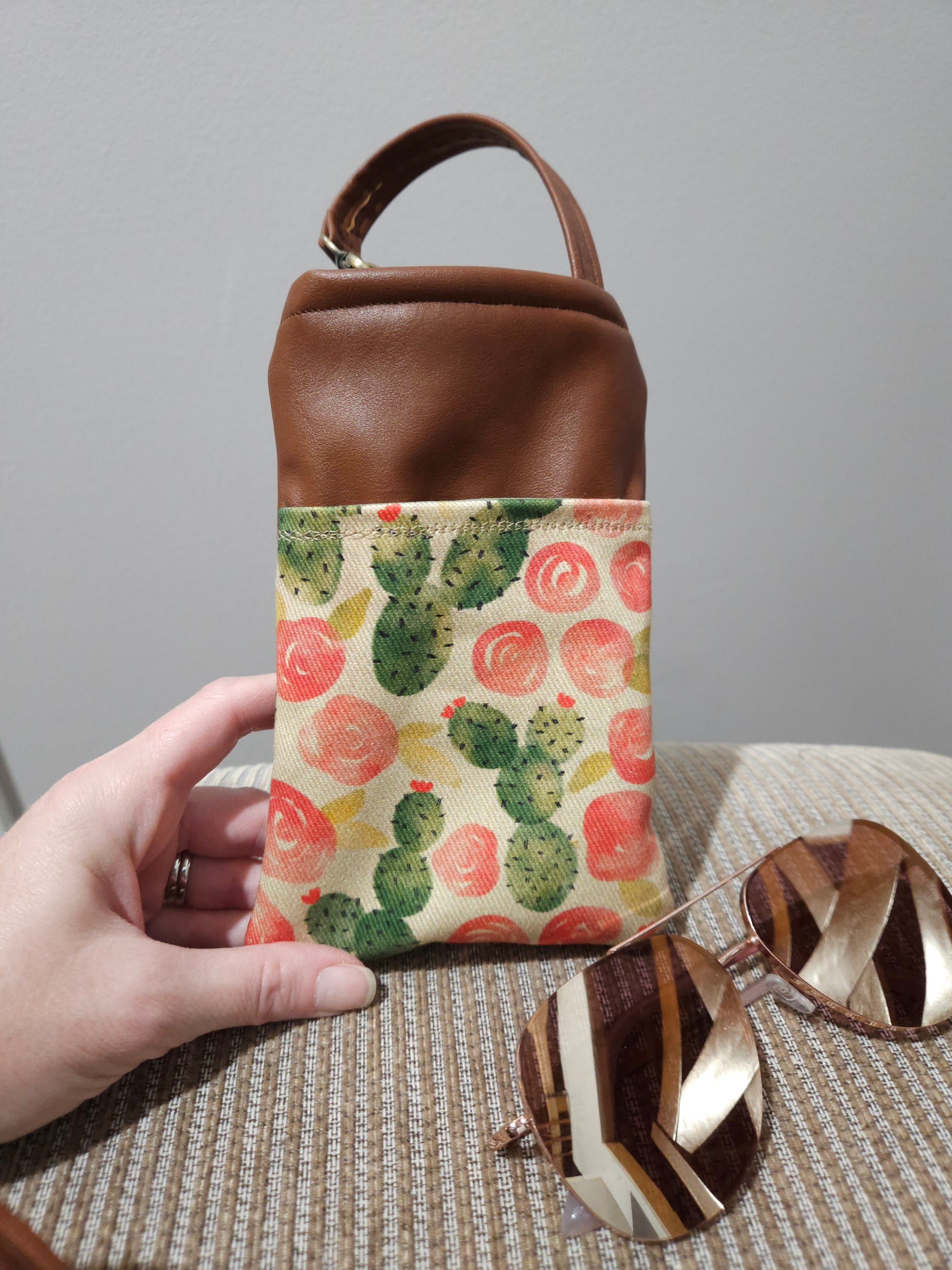 This is handmade by me. I combined two designs I found into this one unique pouch! You can unclasp the handle to hang around the inside or outside of your purse strap, so you can find your sunglasses, glasses, or phone easily without rummaging through! You can hang this pouch in your car, from bike handles, or from your belt loop.