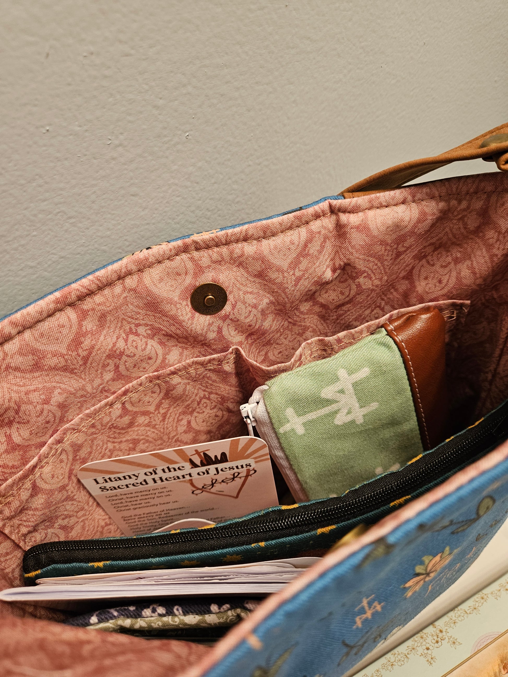 For those who carry just the essentials in a medium-sized purse with the Latin "Fiat" which was Mary's answer of "Thy Will Be Done" to the angel Gabriel at the Annunciation on the Catholic faith. Dusty blue background.