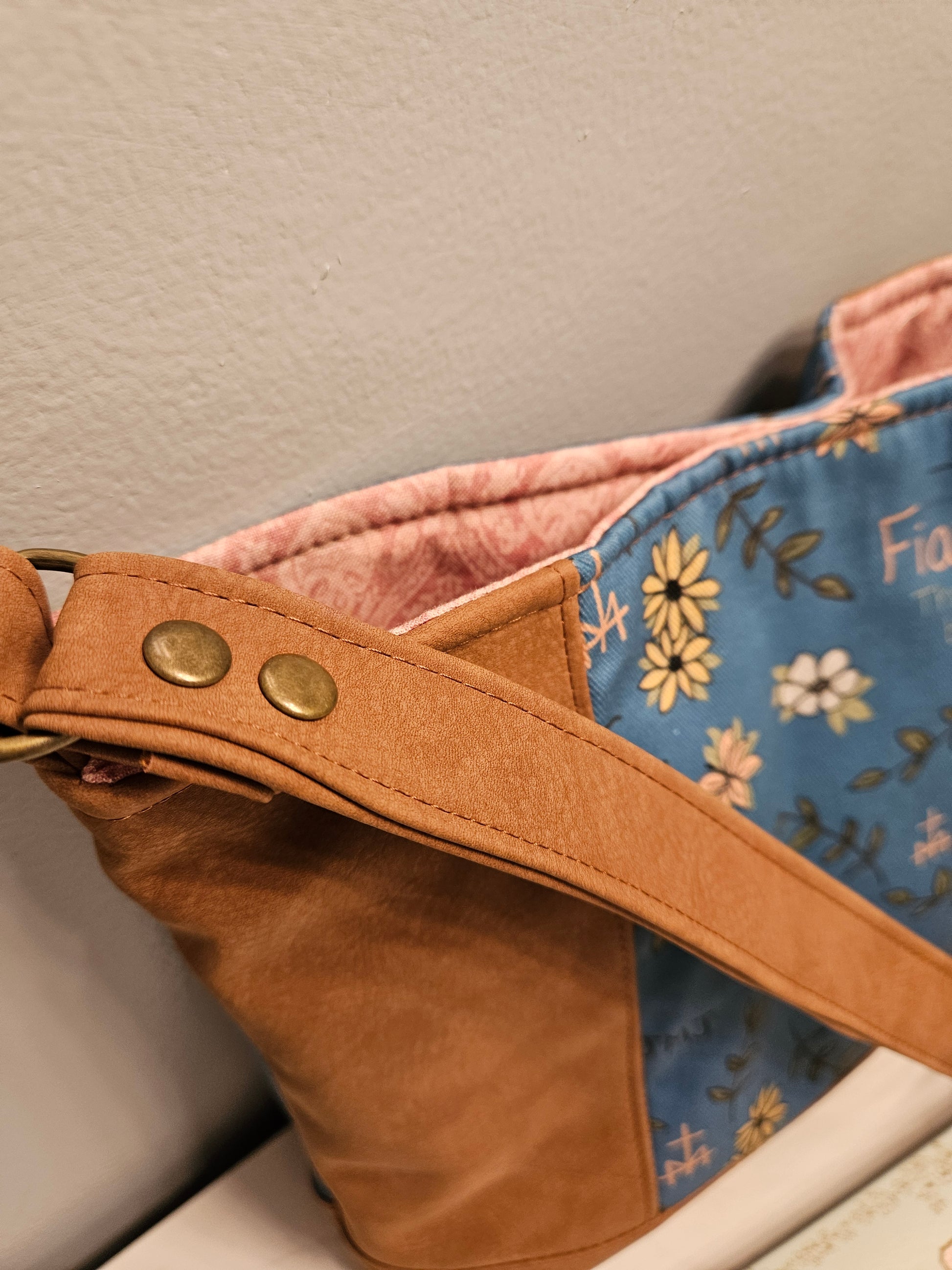 Medium-sized purse with asymmetrical panels of the Catholic fabric with faux leather.