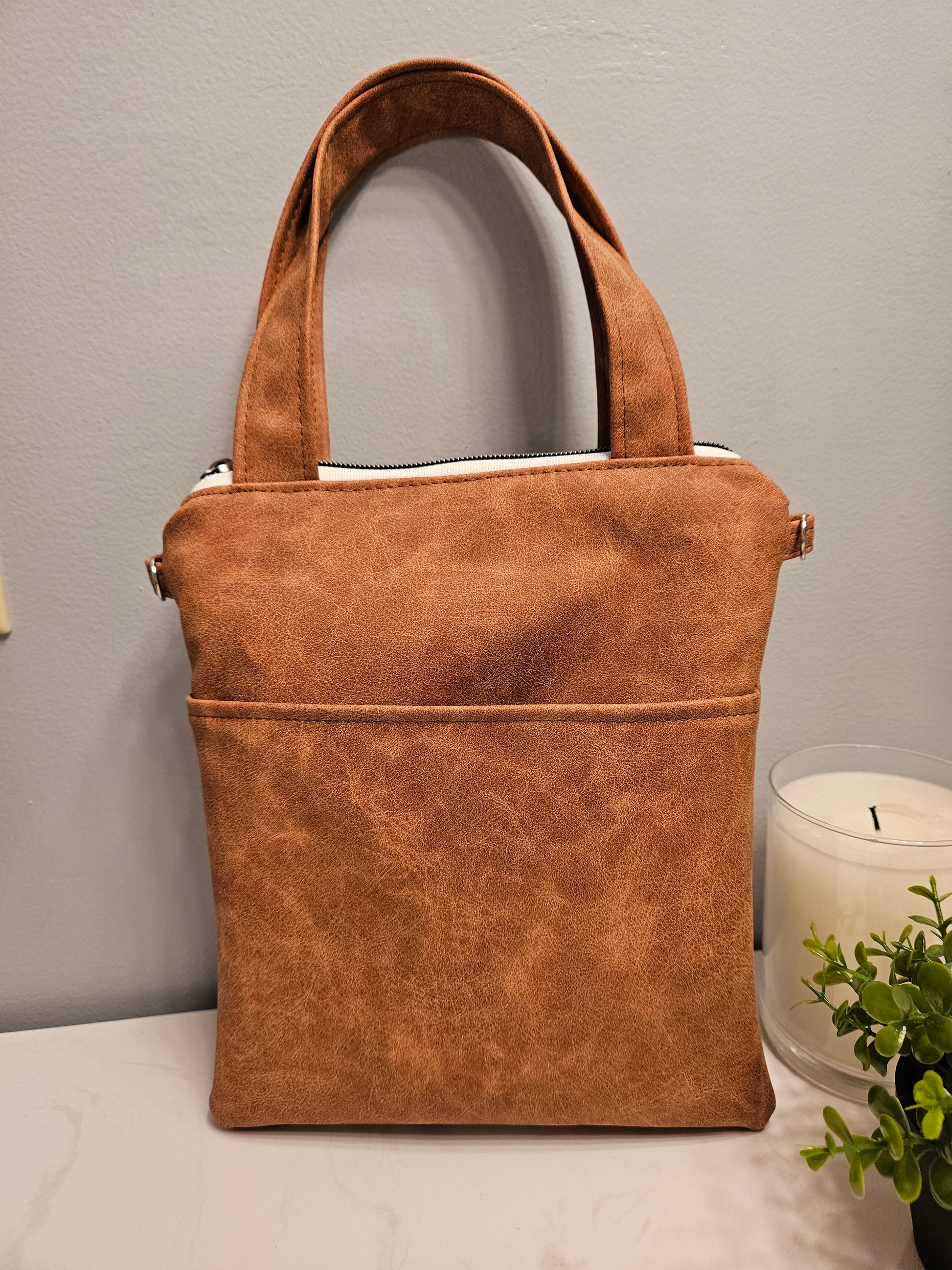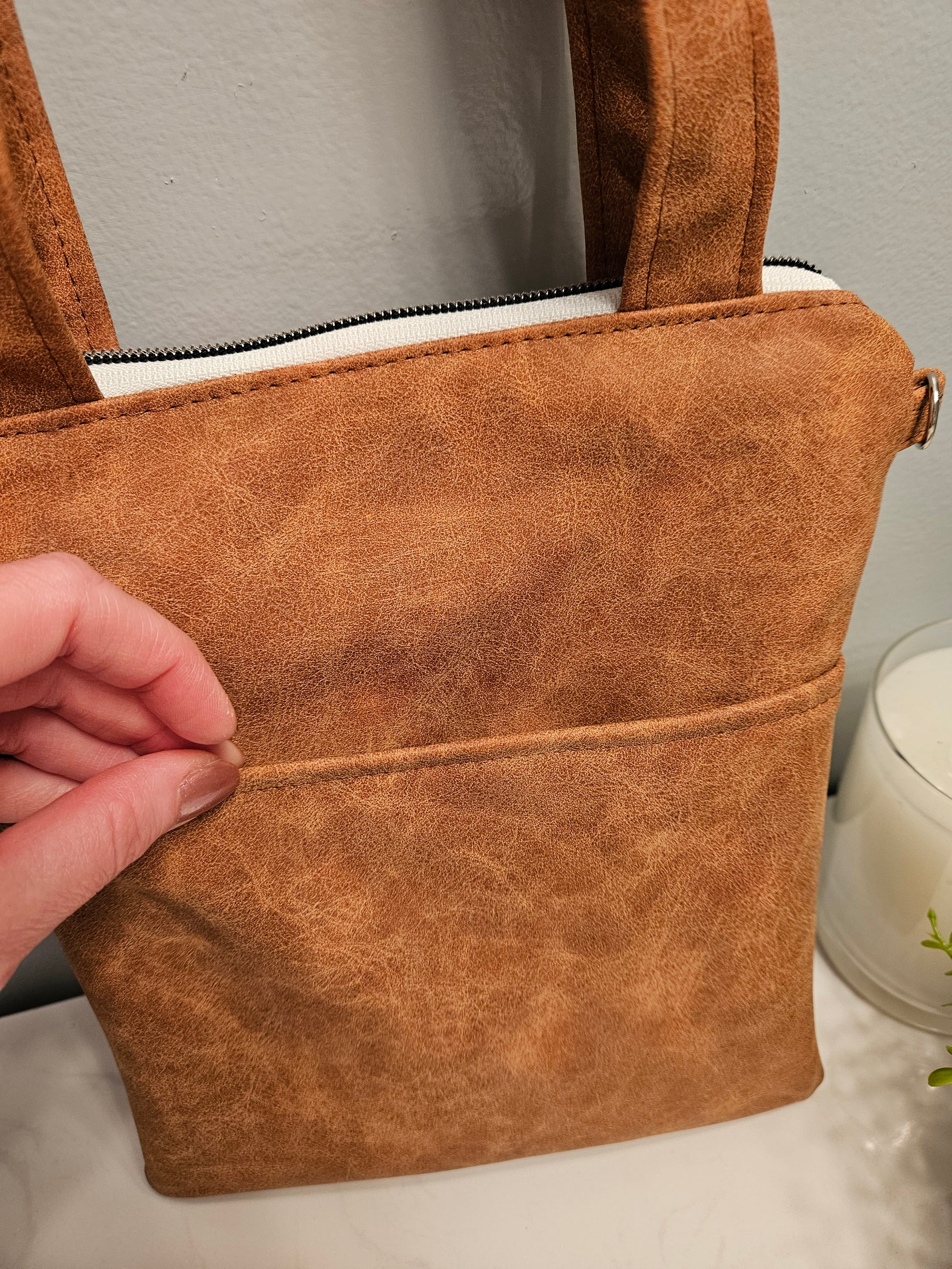 The purse is made with faux leather, denim cotton and water-resistant wipeable canvas for the interior fabric. There are d-rings included as an option for you to add your own style of crossbody strap if you choose.