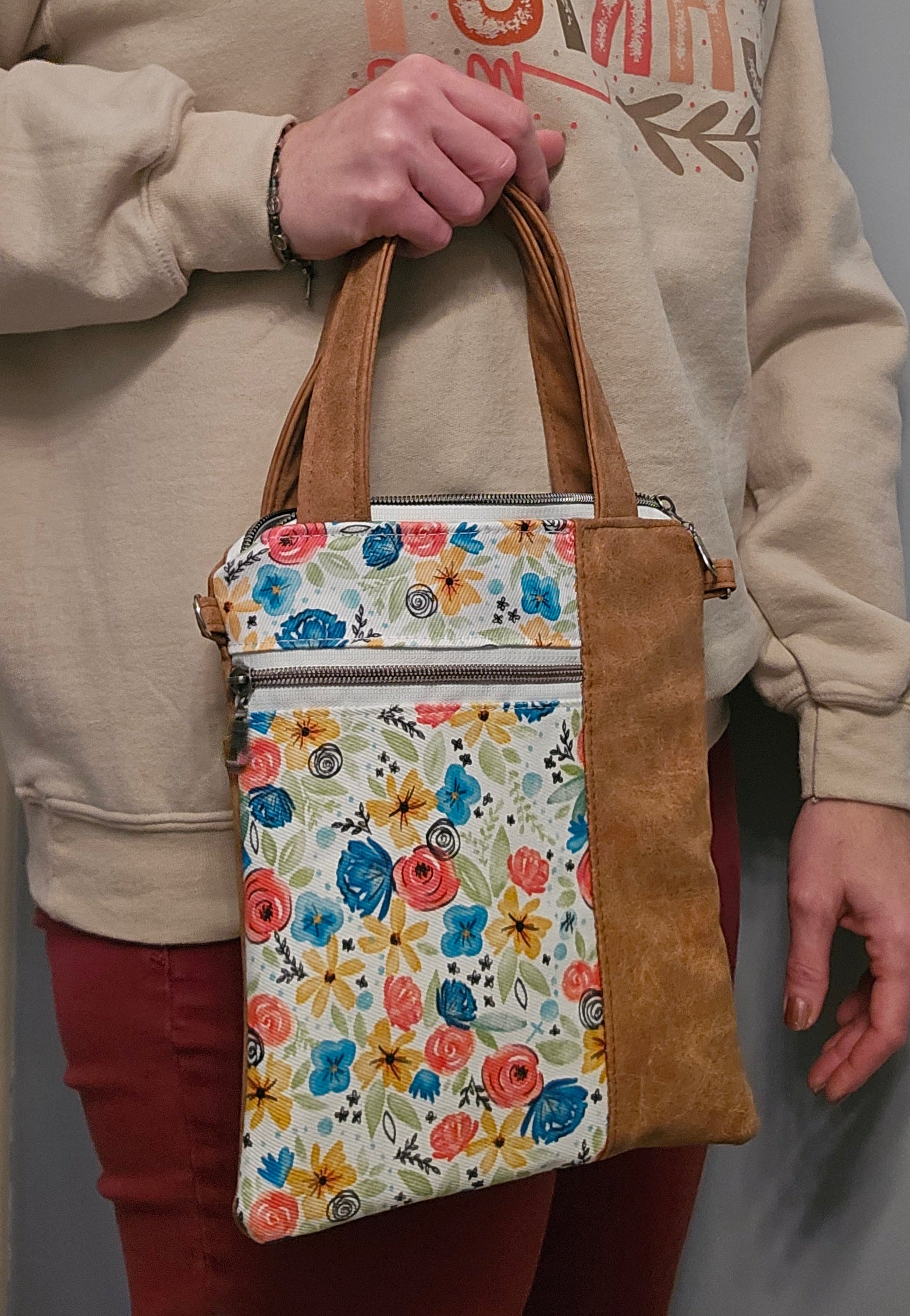 This short handled flat purse features the Hidden Rosary fabric deisgn by thelittleroseshop with a light blue rosary among the florals. It's a convenient bag to carry just the essentials for a trip out of the house. A slip pocket is included on the back exterior as well as on the inside.