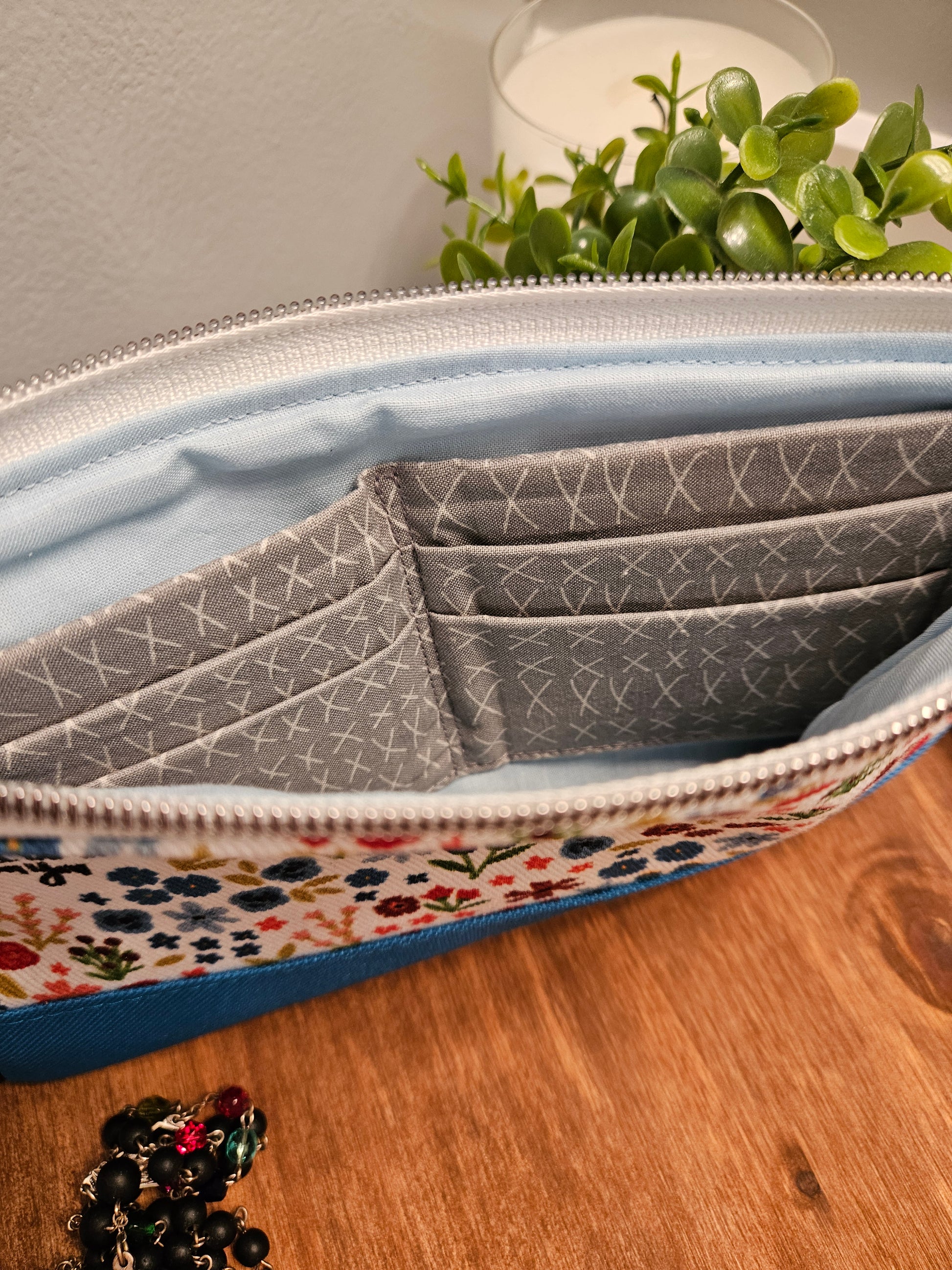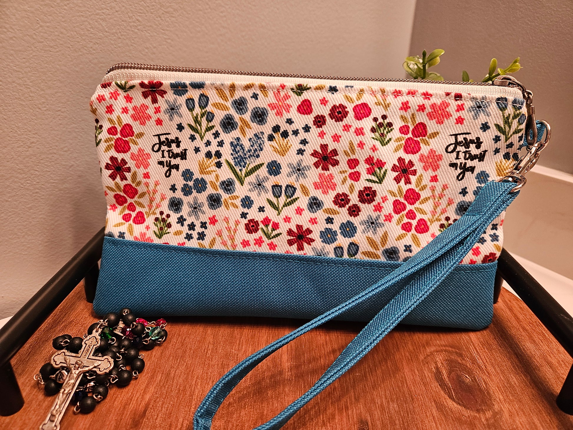 "Jesus, I Trust in You" is featured on each clutch inspired by the Chaplet of Divine Mercy. This Catholic fabric is featured on both sides.