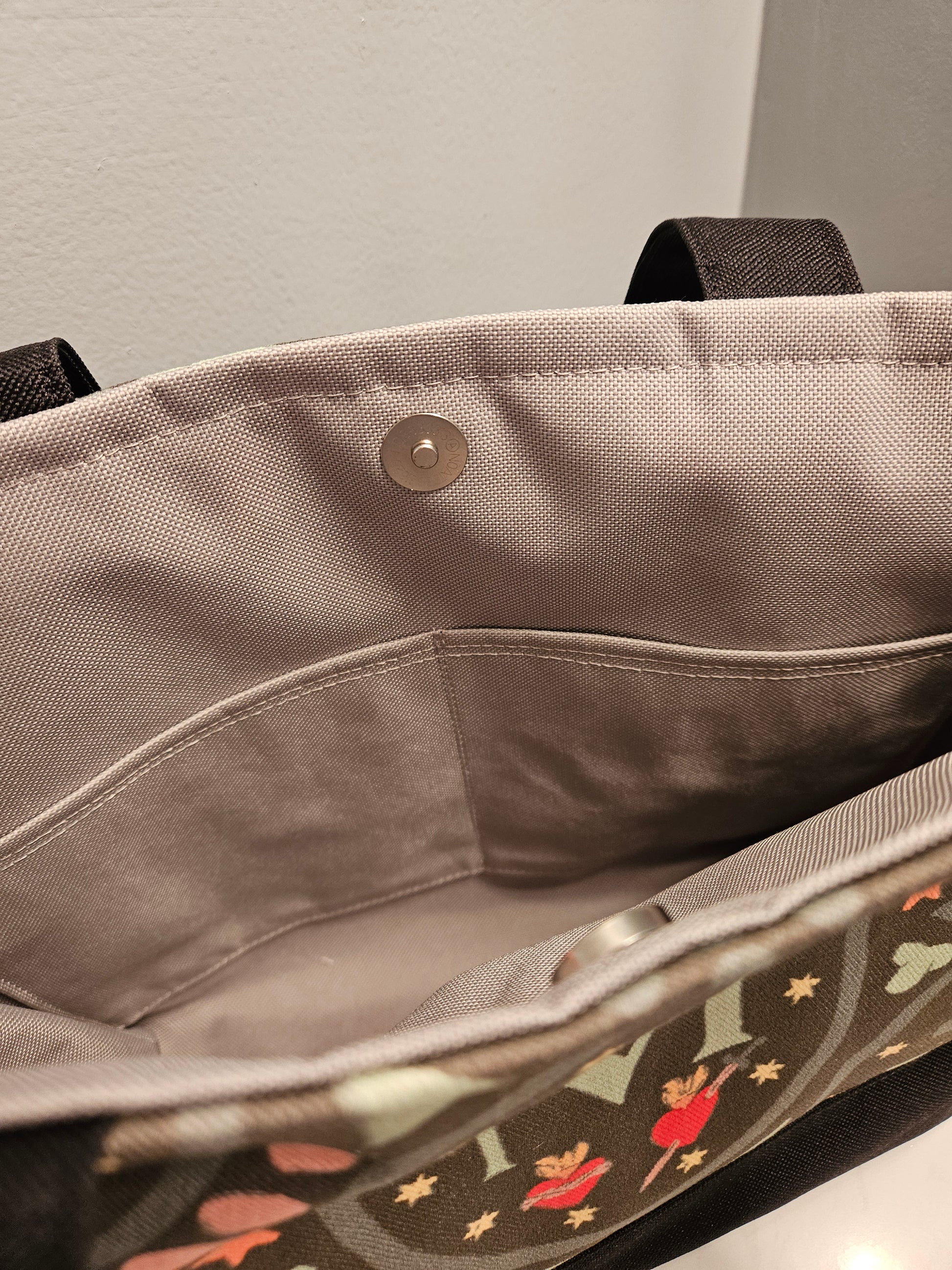This tote bag features shoulder straps and two interior slip pockets along with a magnetic snap. The interior waterproof canvas complements the patterned fabric. The base and handles are of black waterproof canvas as well.