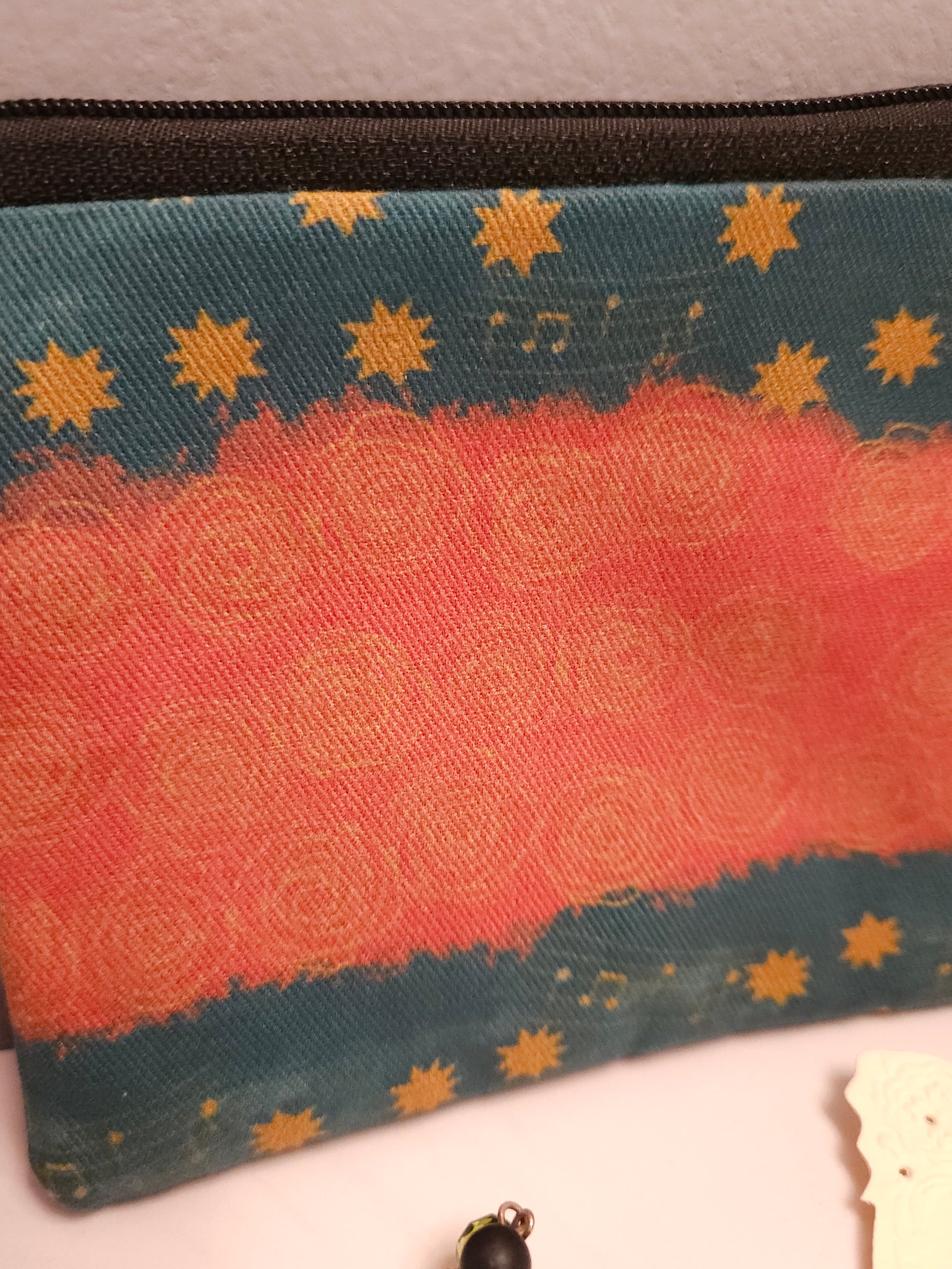 Approximately 5" wide x 4" tall zippered pouch with nylon zipper