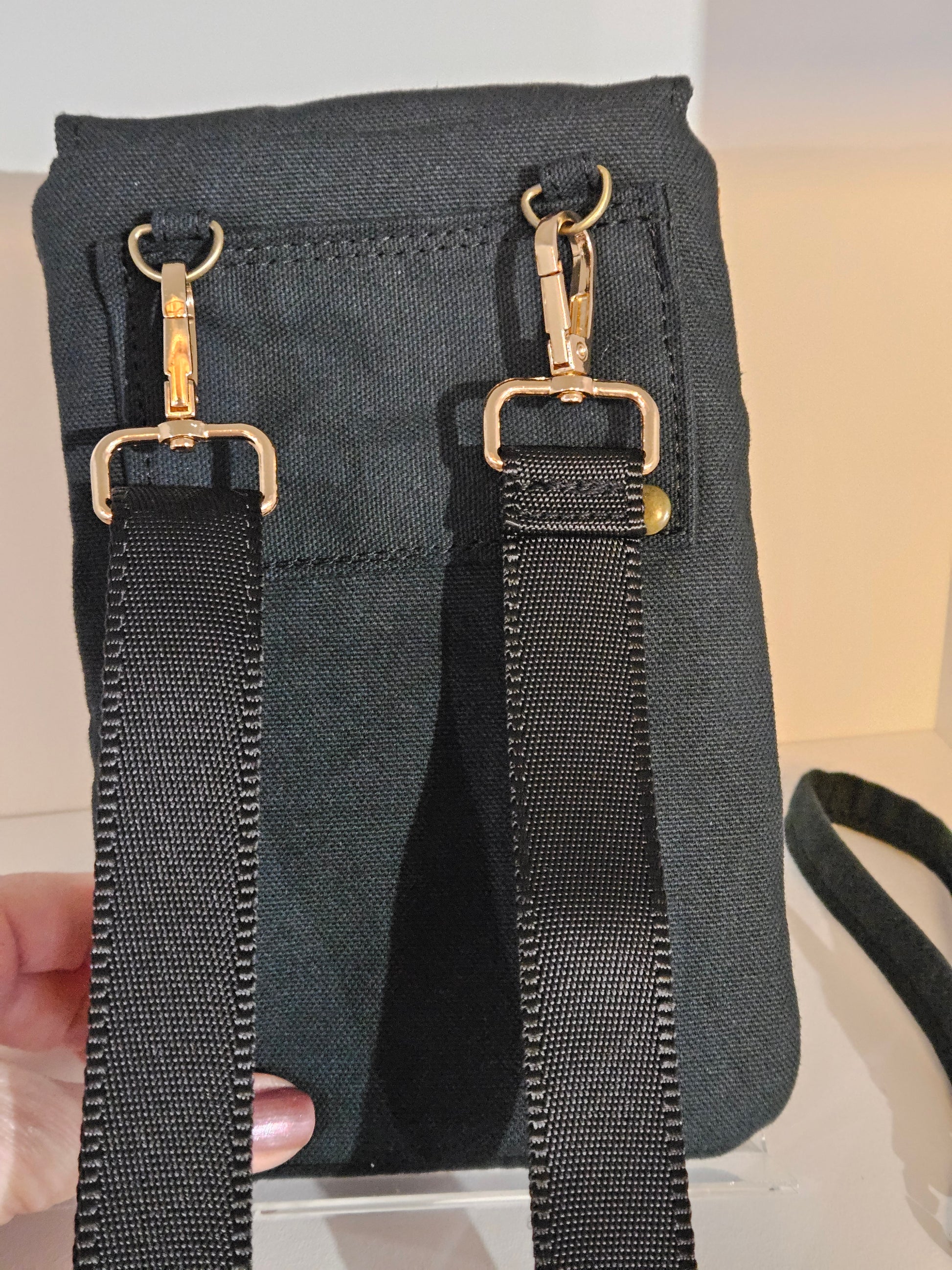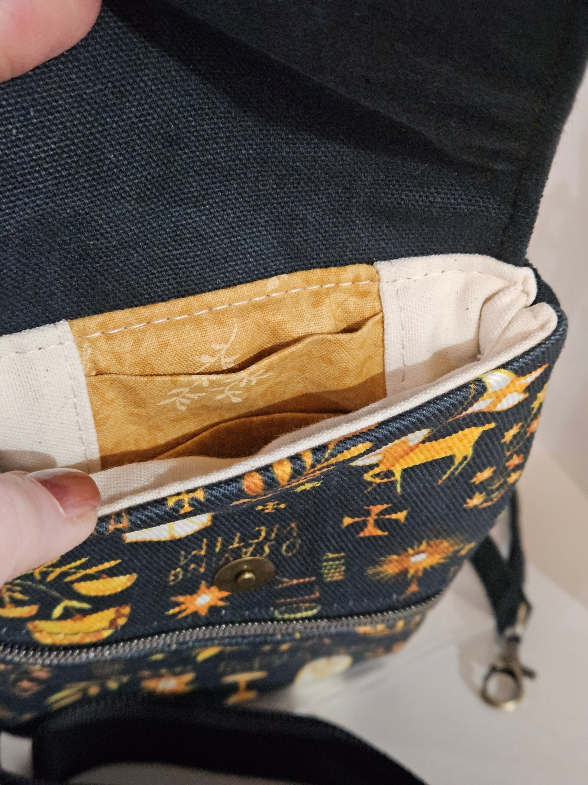 The purse is made of black canvas and cotton denim Catholic fabric- all for durability.