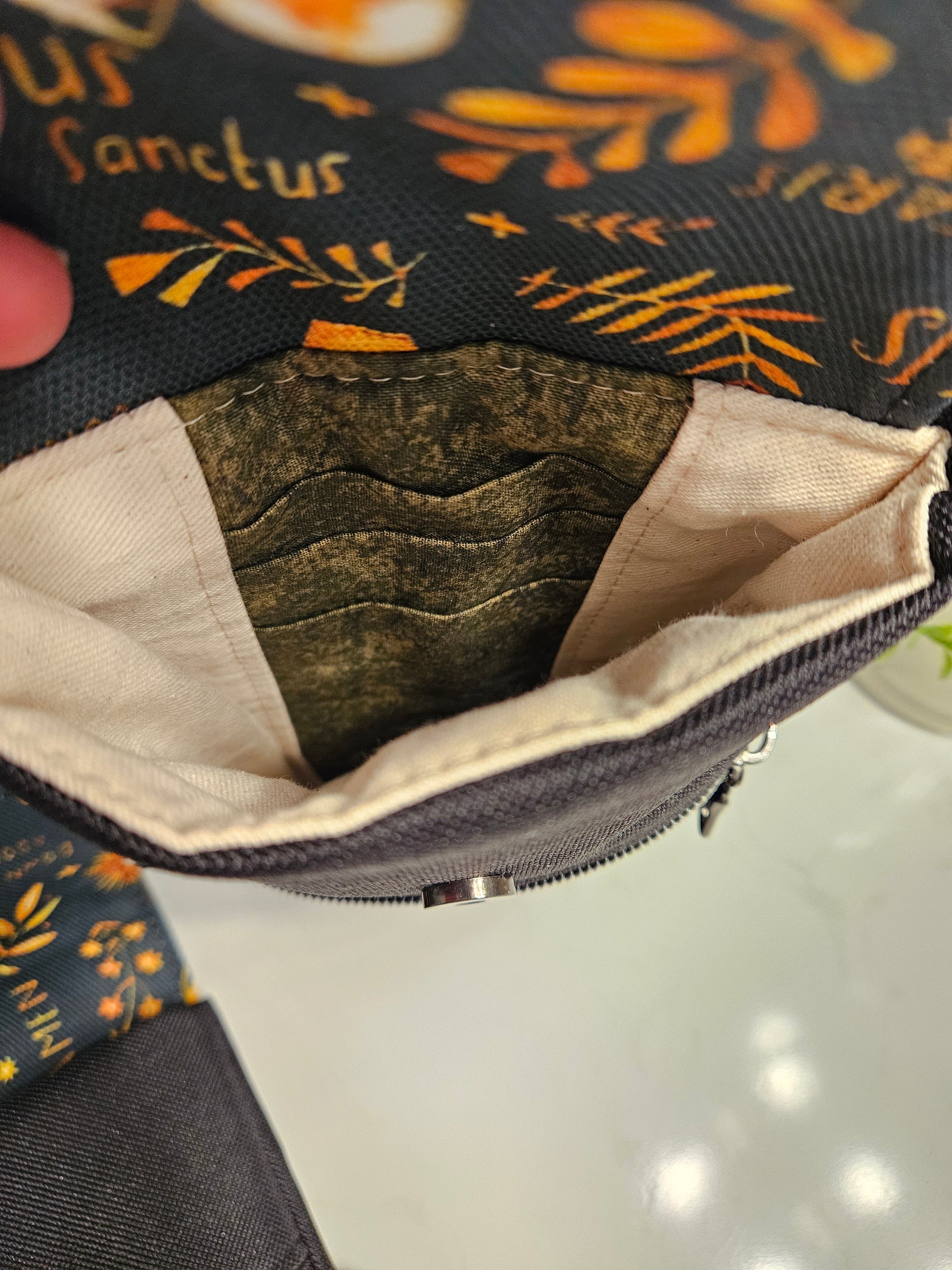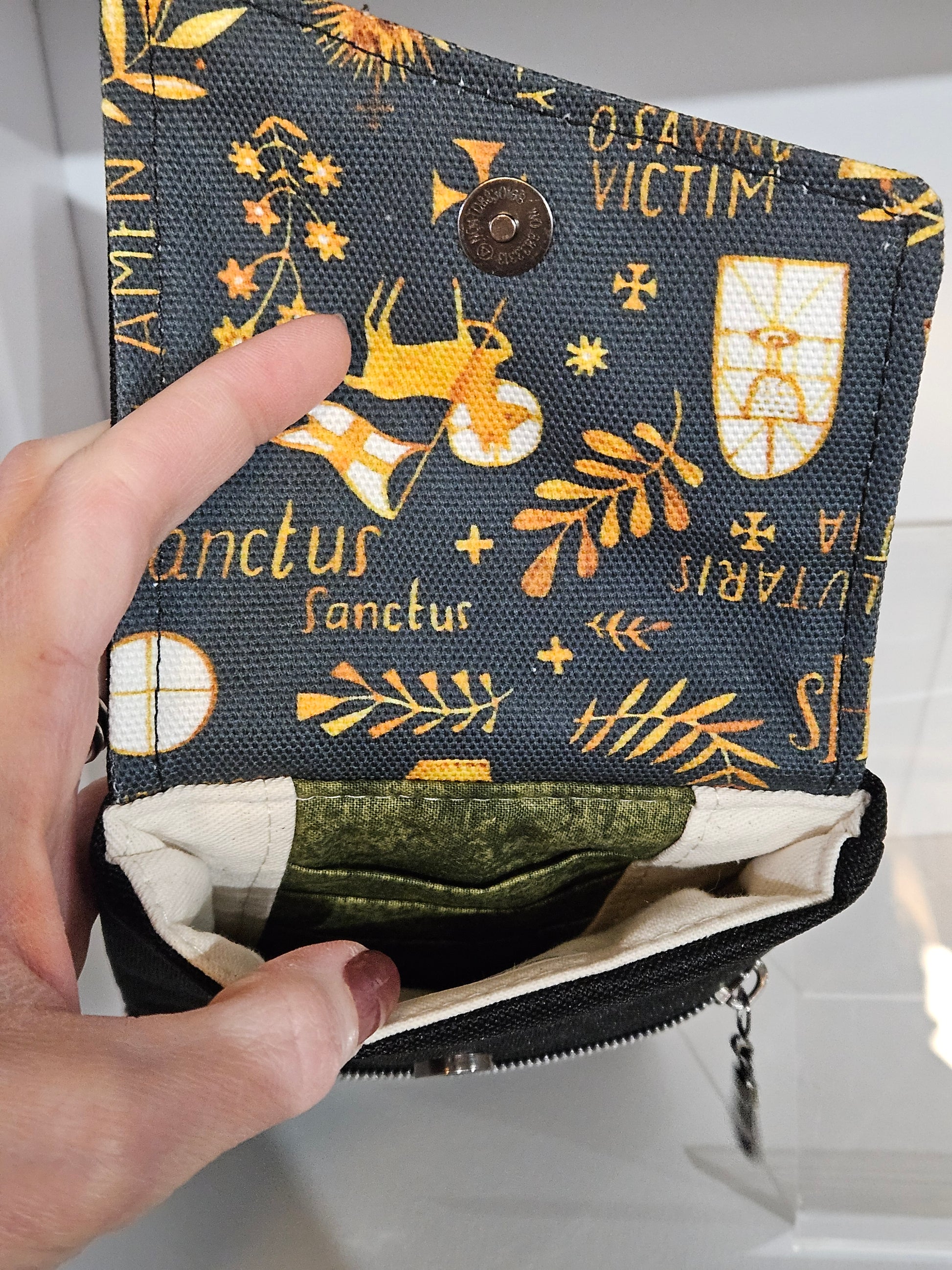 The pouch is made of black canvas and cotton denim Catholic fabric- for durability.