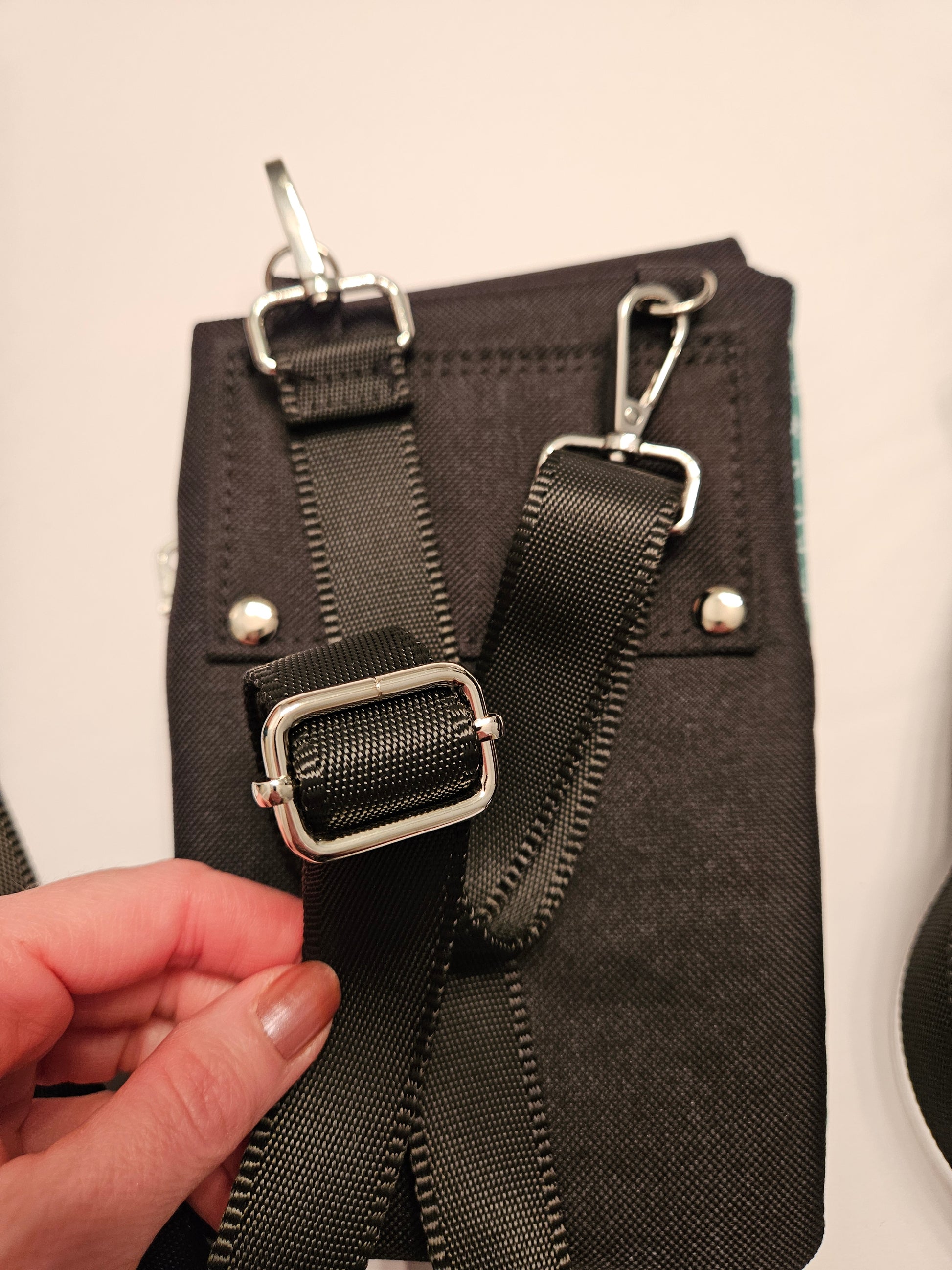 There are two d-rings on the back to attach the black nylon crossbody strap.