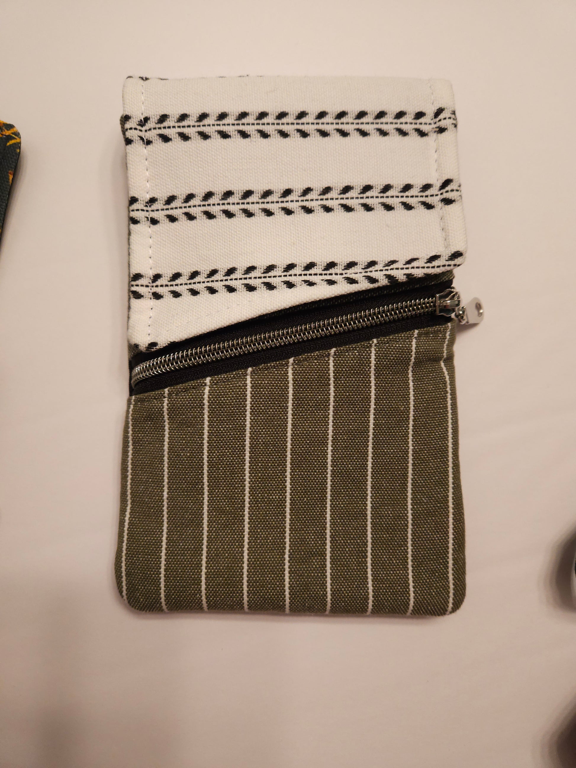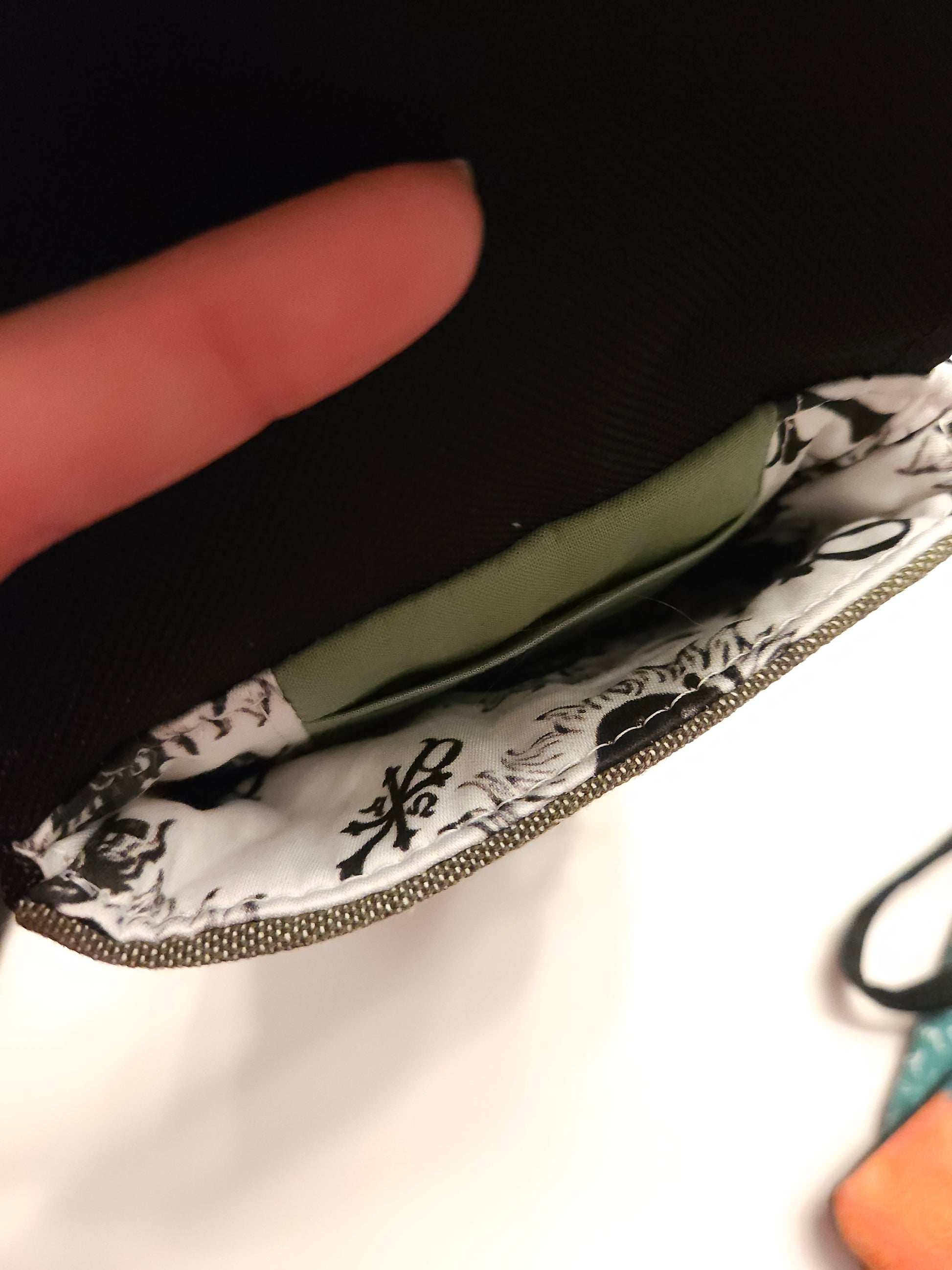 A neutral green patterned purse with a hint of the Catholic asthetic on the inside.