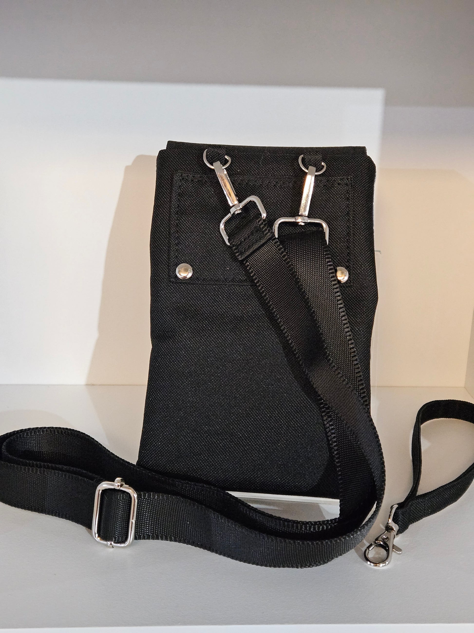 There are two d-rings on the back to attach the black nylon crossbody strap.