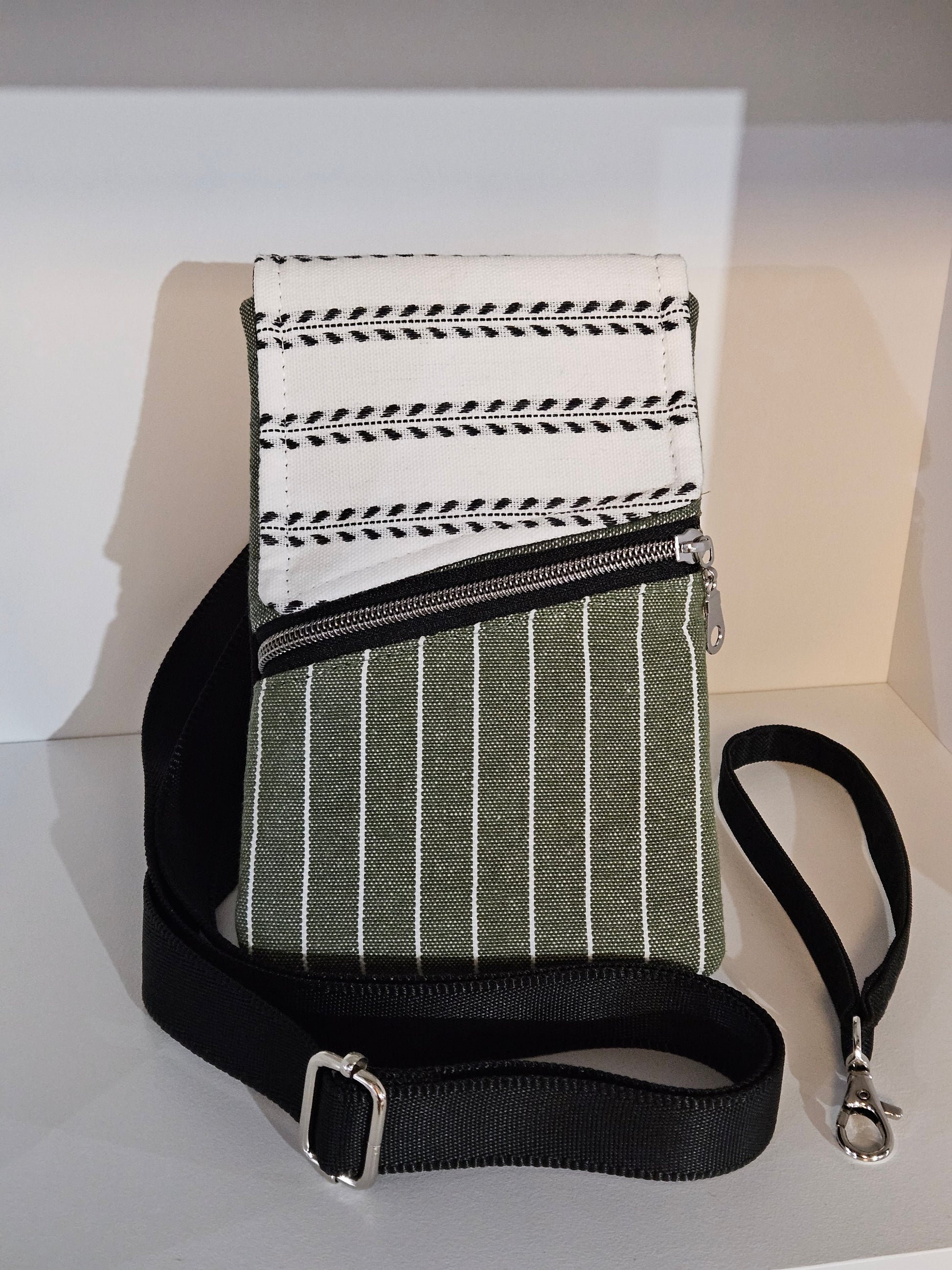 The purse is made of black water-resistant canvas, cotton denim and cotton Catholic fabric- all for durability.