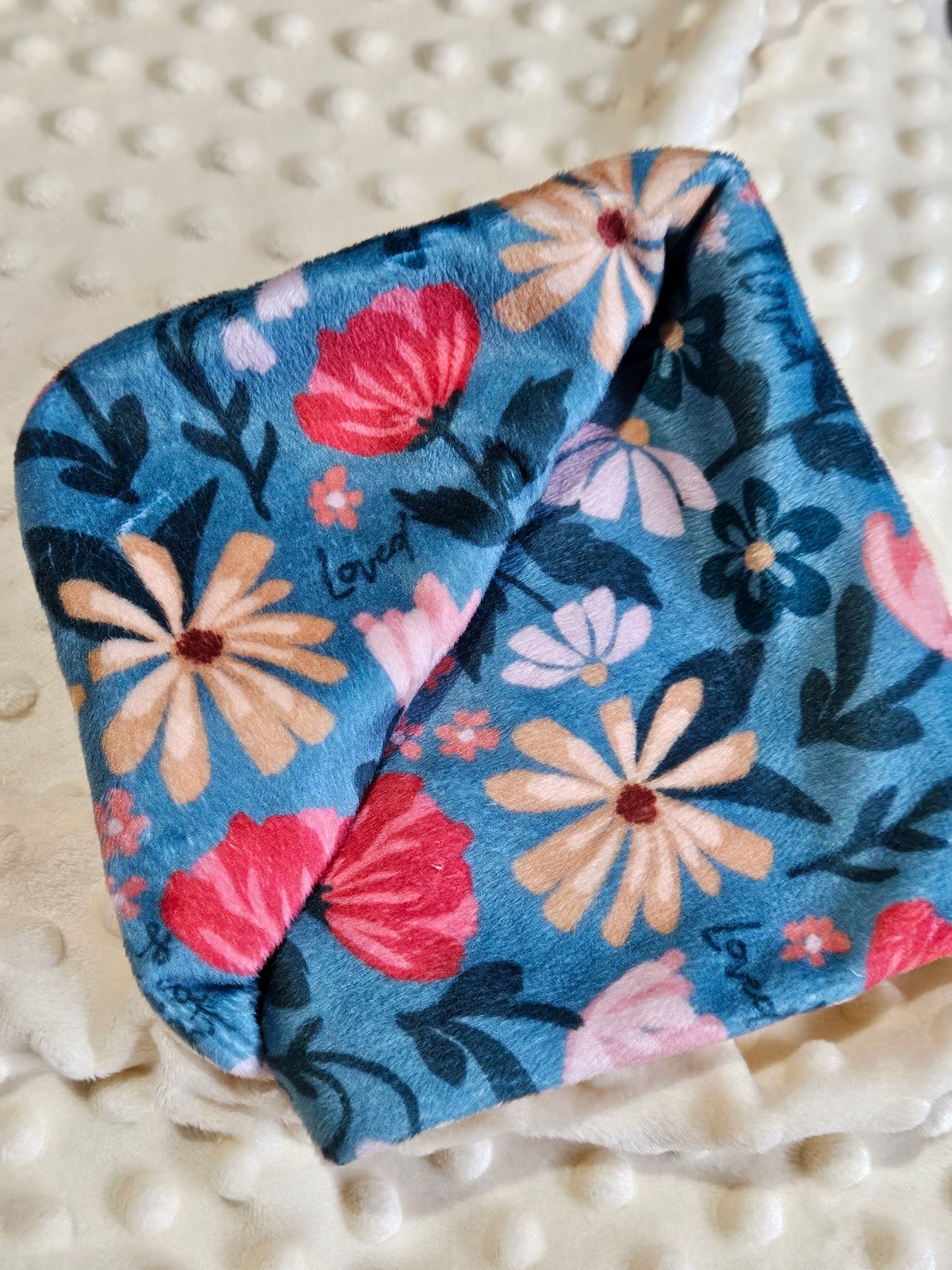 Choose from a soft minky blankie or a minky taggie. Double sides of softness for your little one featuring the flowers with "Precious in His Sight" in a deep teal background with yellow backing.