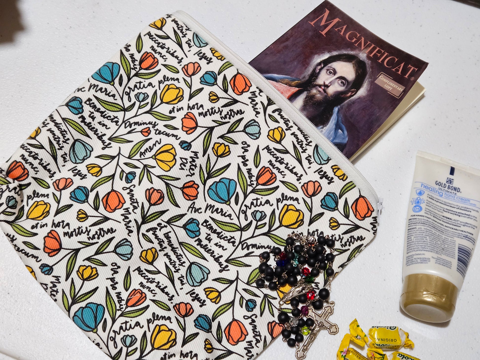 Keep your smaller items together in one clutch featuring your favorite Catholic graphics.