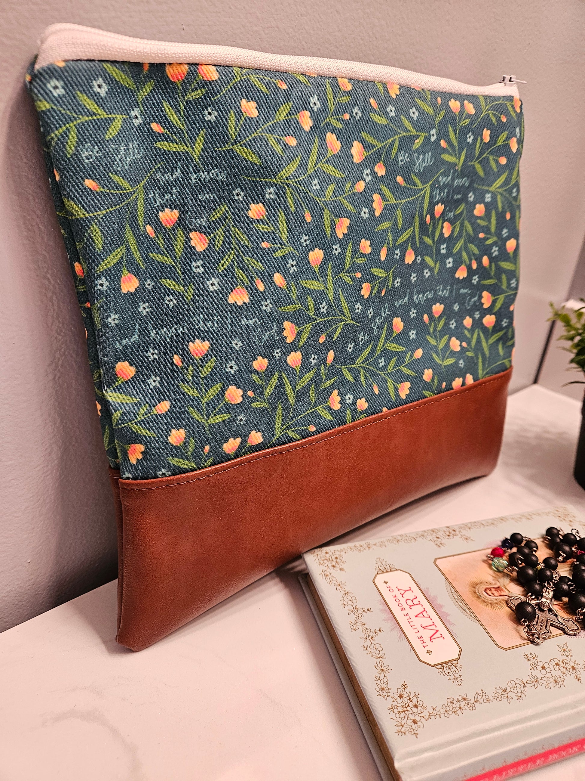 The Catholic fabric is made of cotton denim for sturdiness and the pouch has a polyester zipper.